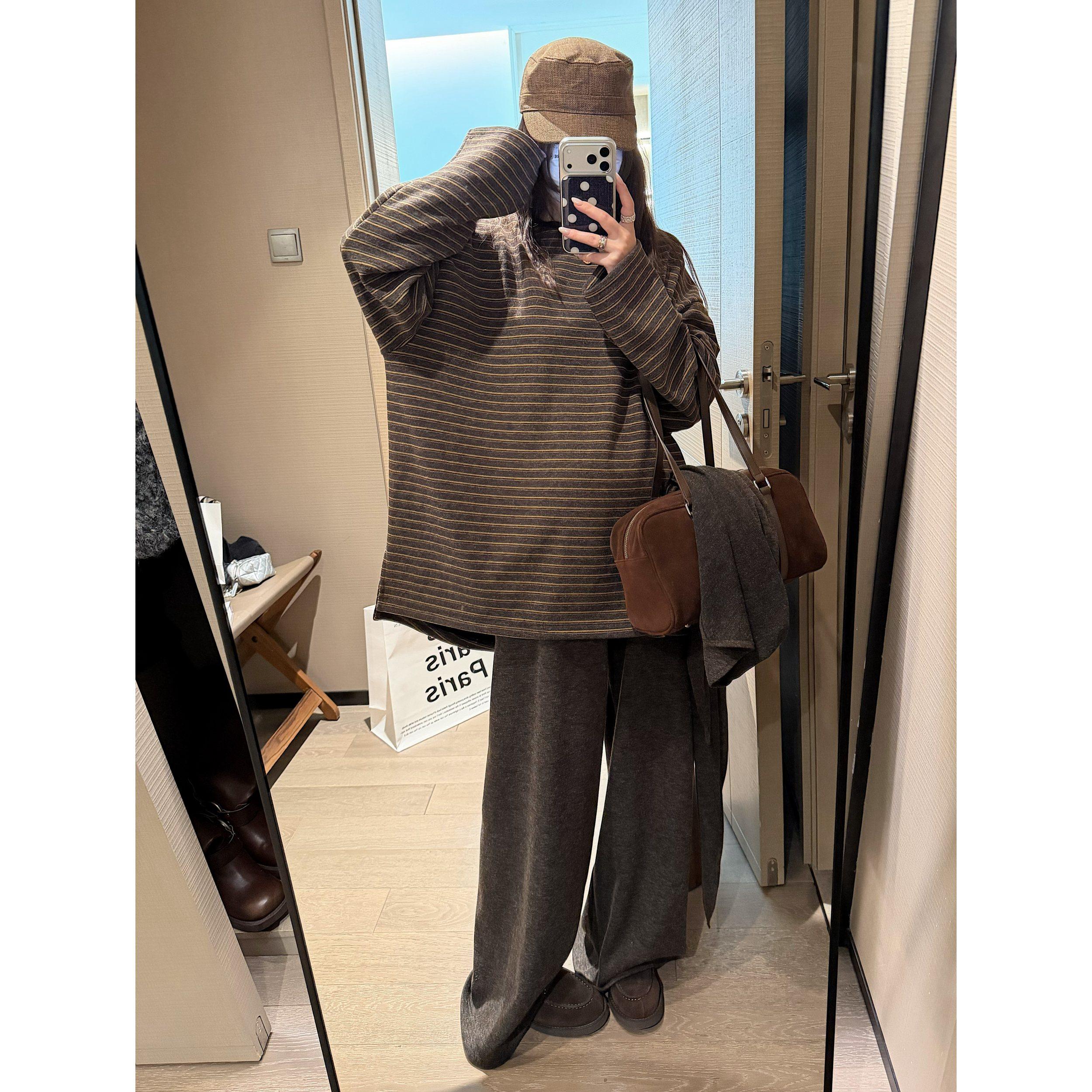 小个子百搭休闲裤 子女高腰垂坠感窄版 米白色加绒加厚阔腿裤 秋冬季