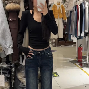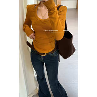 显瘦褶皱收腰磨毛打底衫 小时代2025新款 修身 挂脖U领长袖 上衣 韩版