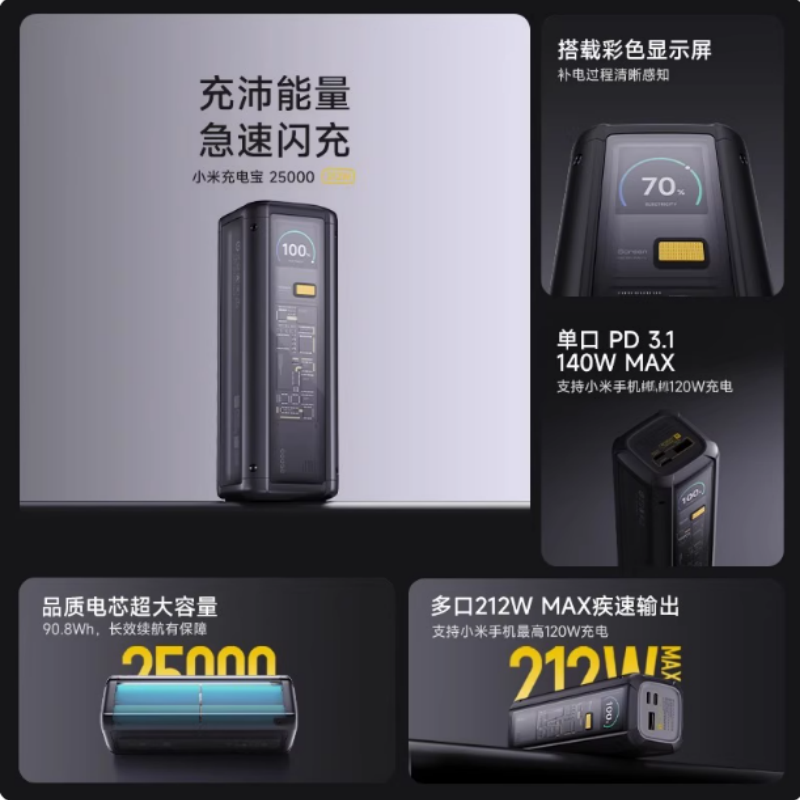212W高功率双向快充单口可上飞机 小米充电宝25000 3C认证