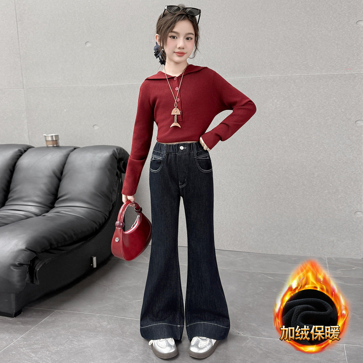 大童裤 左西女童加绒牛仔裤 春秋2025新款 儿童弯刀裤 子 防褪色秋冬款
