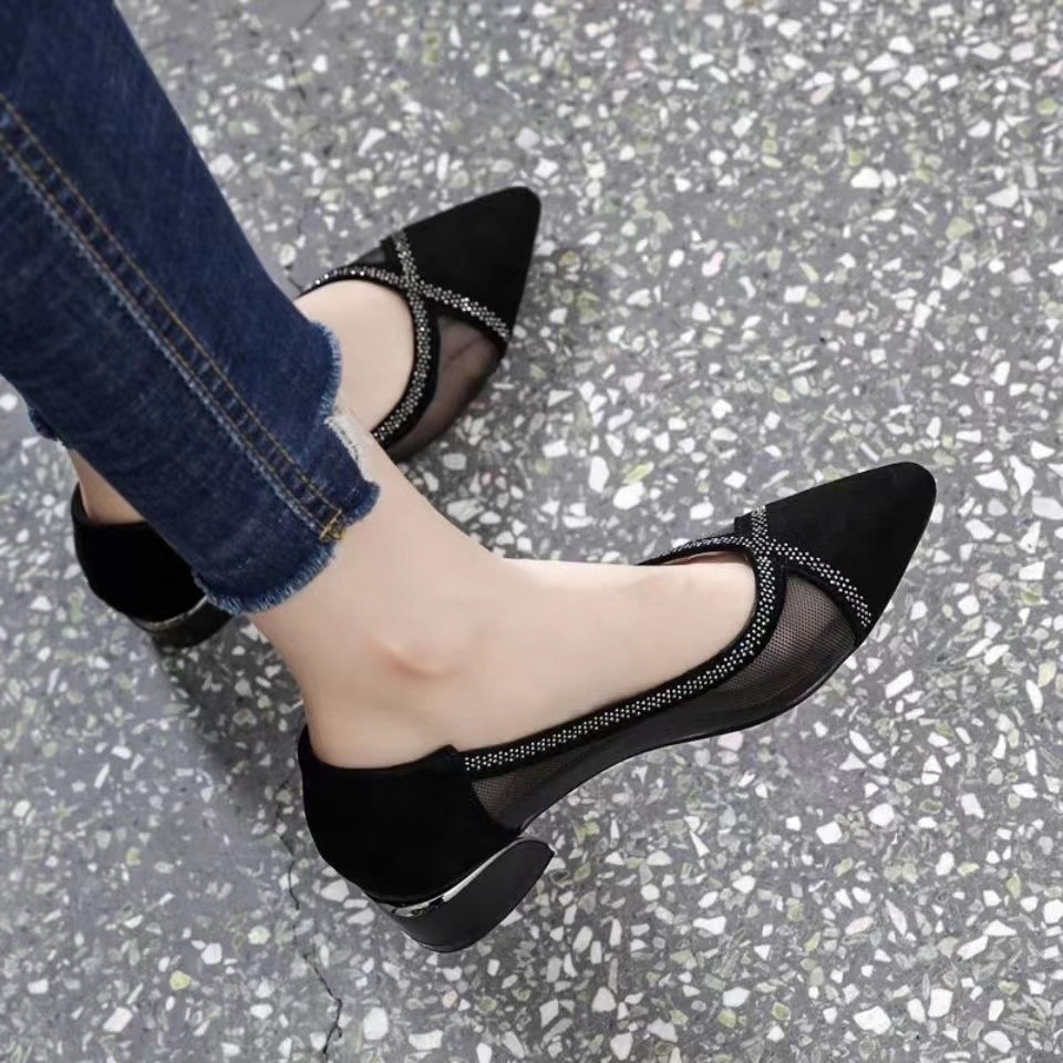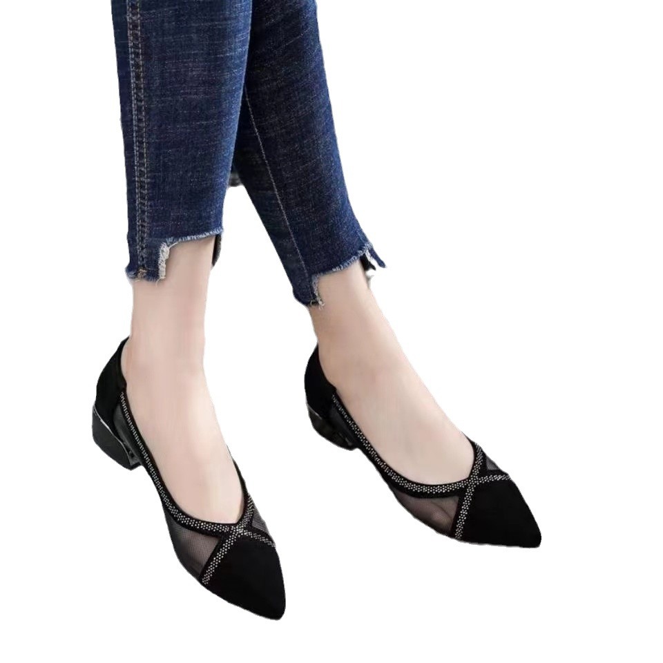 夏季 2025新款 浅口低跟透气尖头粗跟妈妈 真皮网纱单鞋 品牌特价