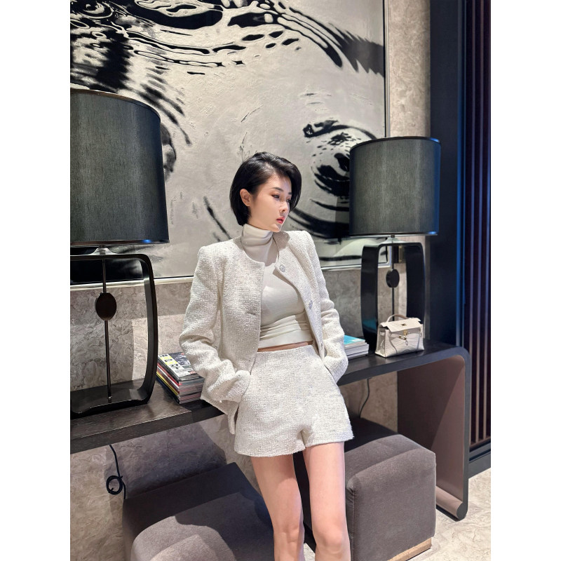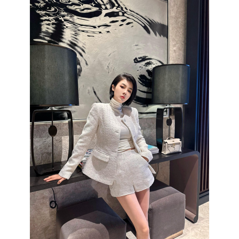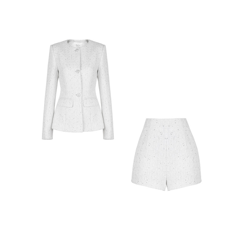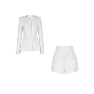 两件套装 XULU原创秋季 优雅粗花呢圆领干练外套气质白色高腰短裤