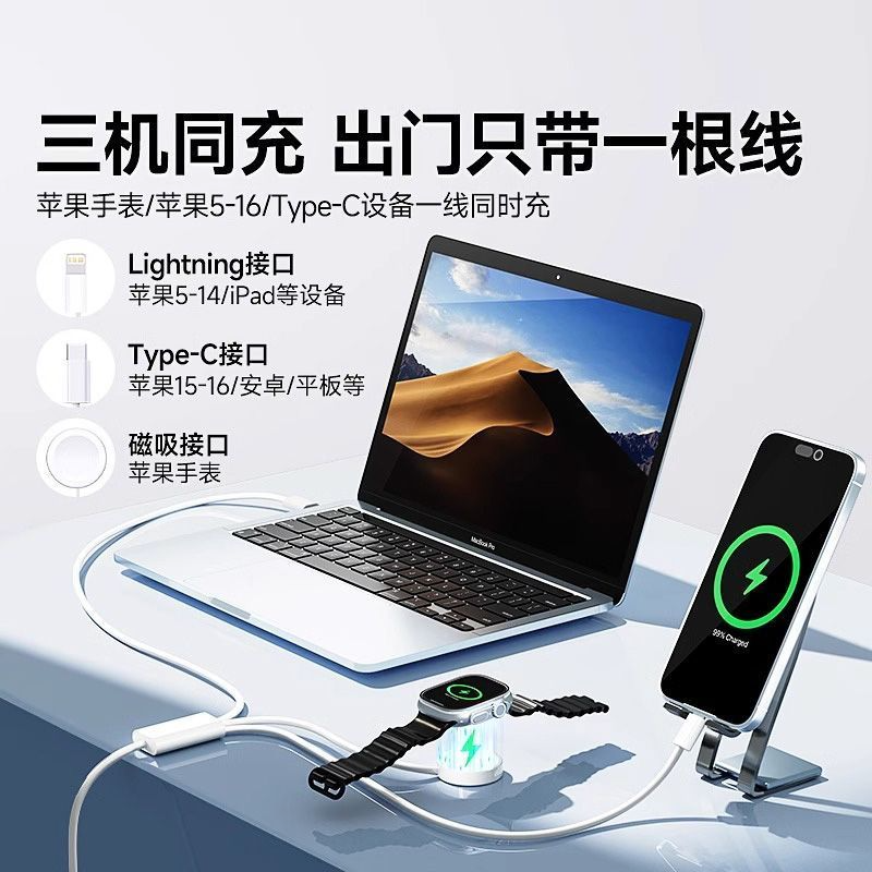 适用苹果三合一数据线耳机手表手机AppleWatch智能手表便携充电器原装 一拖三磁吸无线充电线二合一iwatch快充