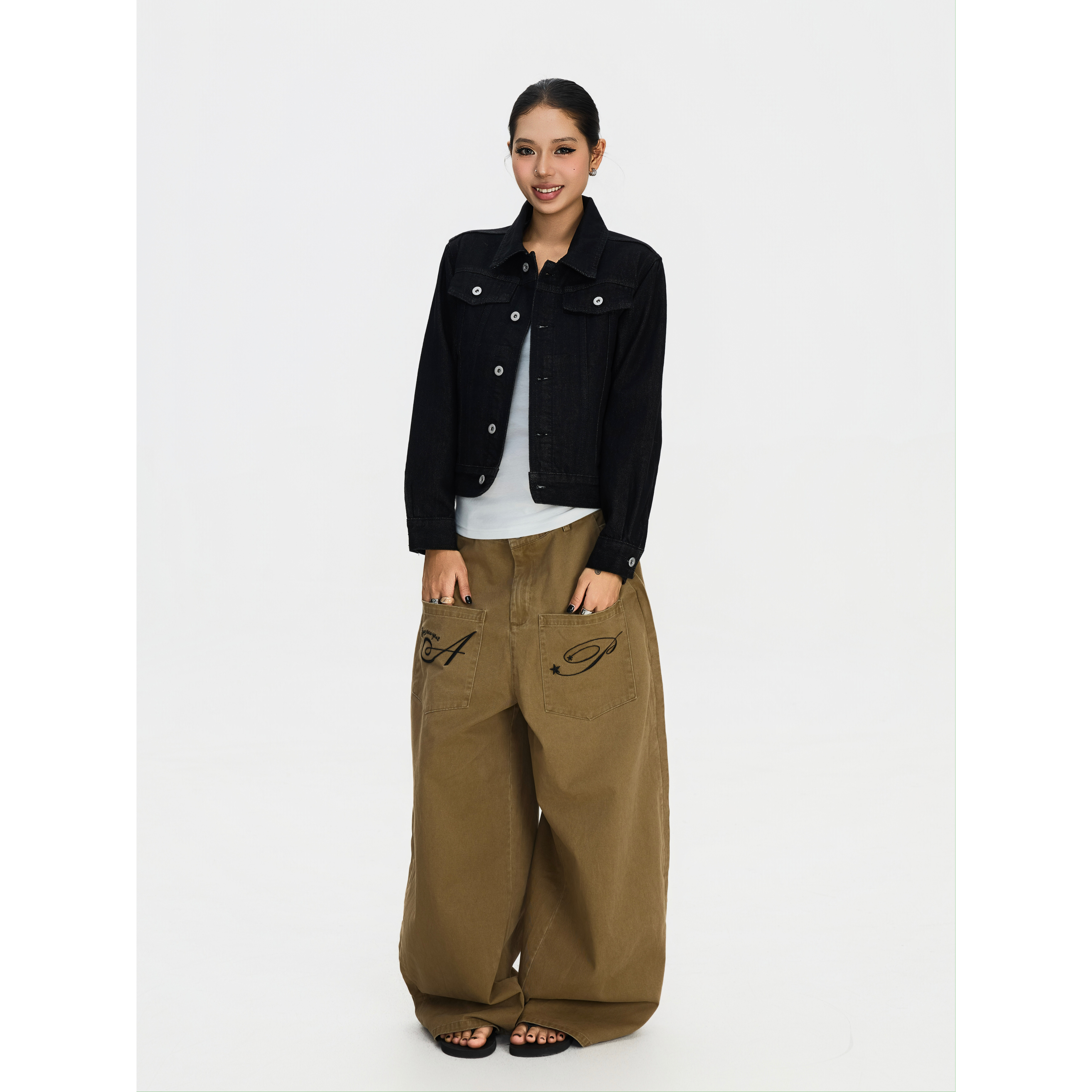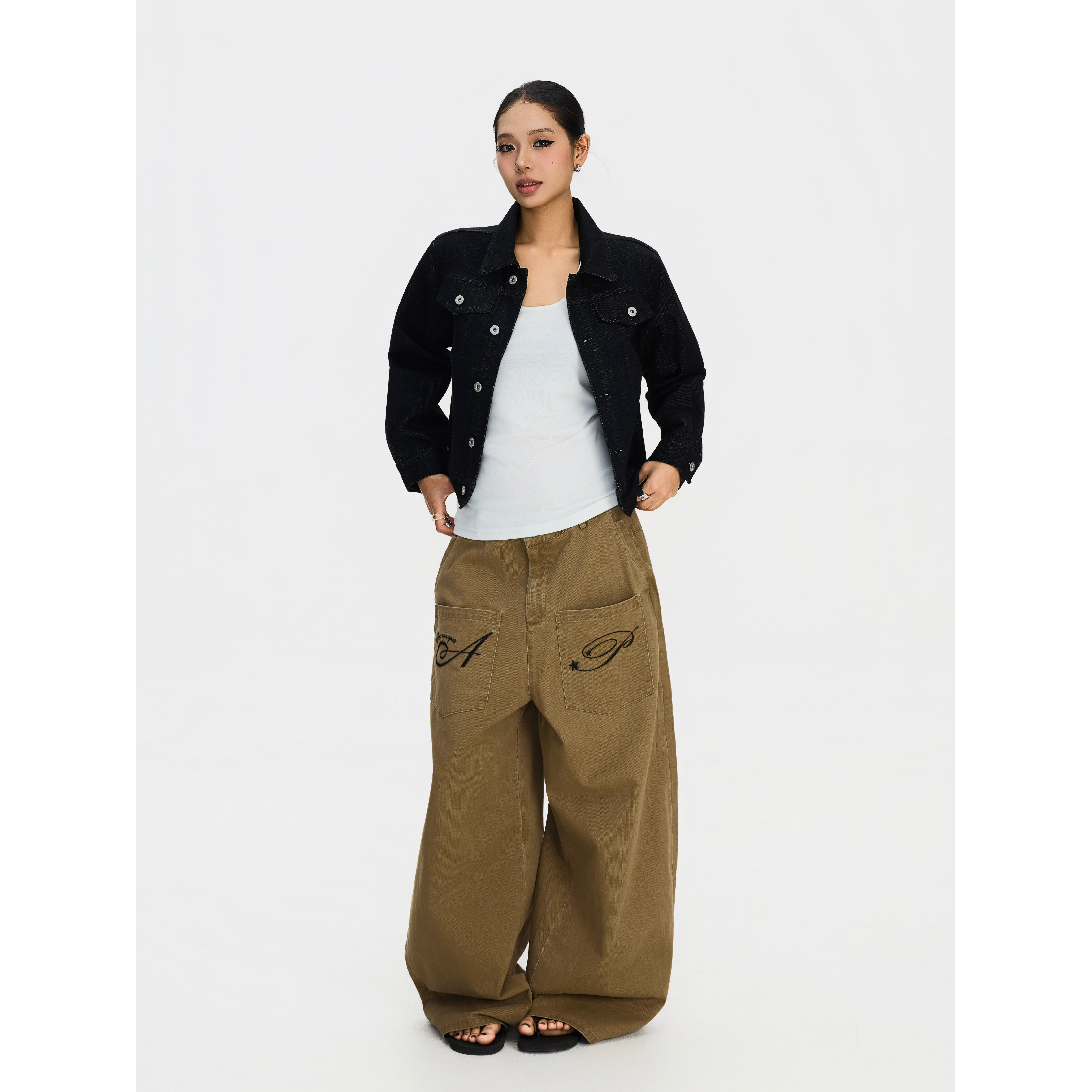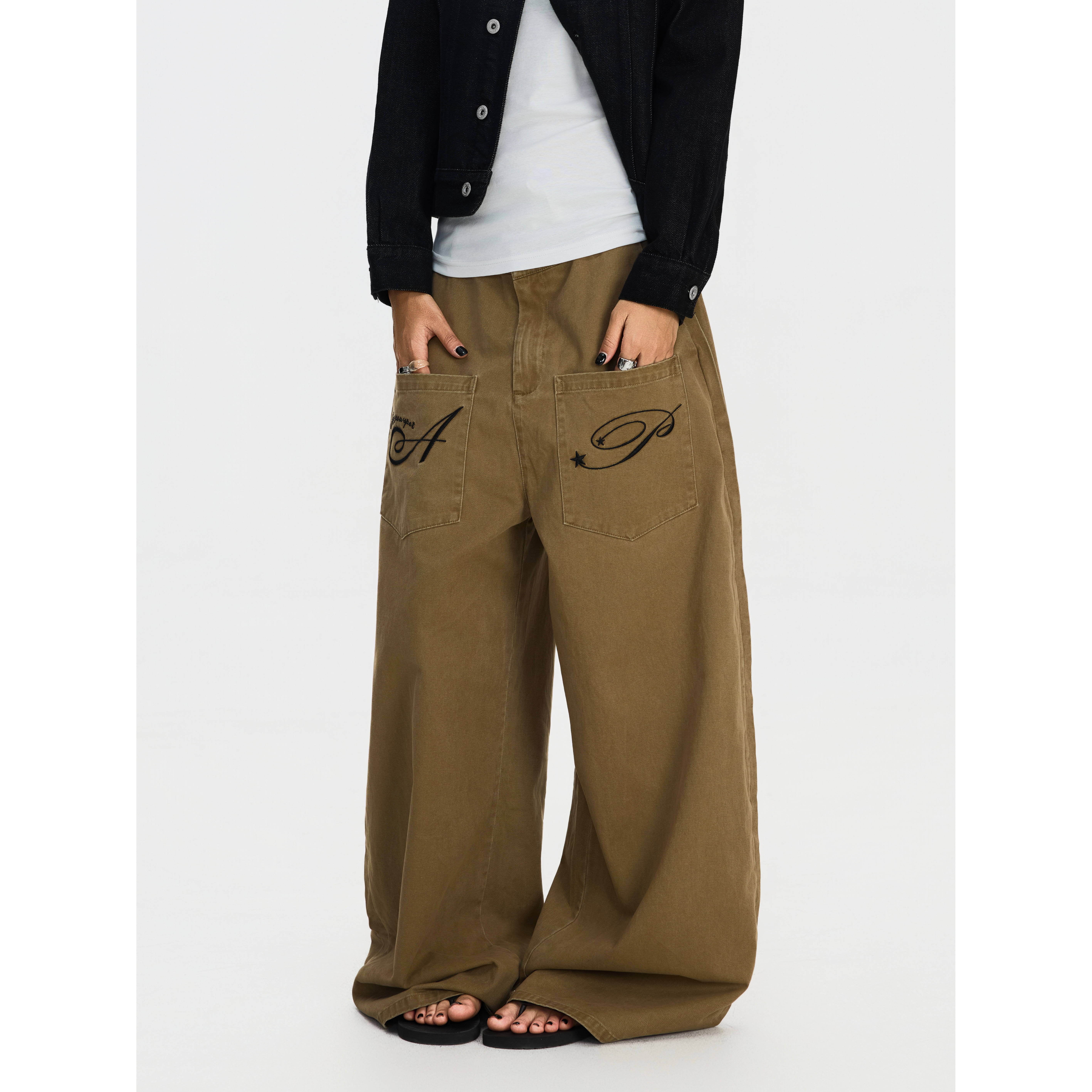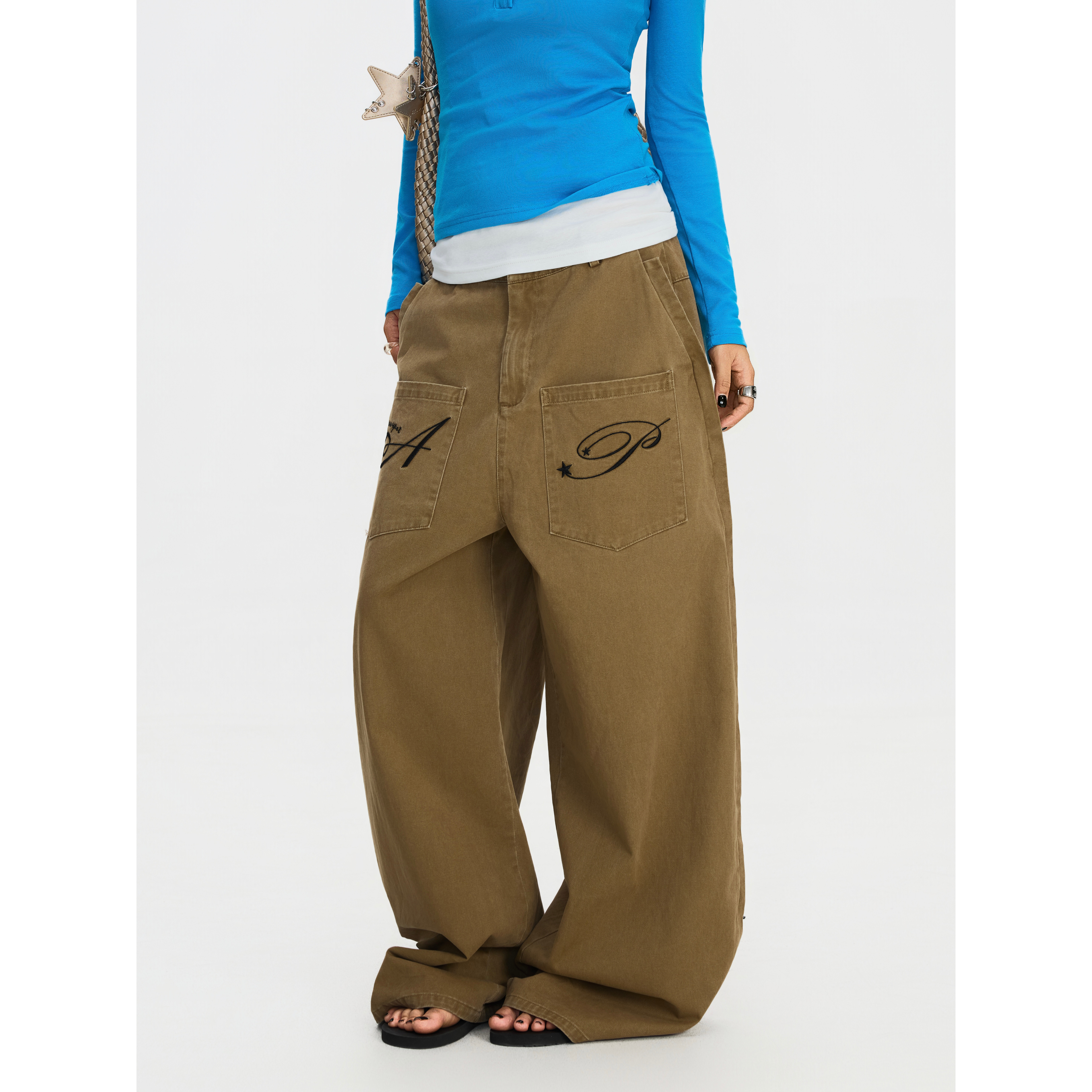 男女宽松弯刀休闲裤 F383 裤 复古反穿口袋设计刺绣阔腿工装 ins 美式