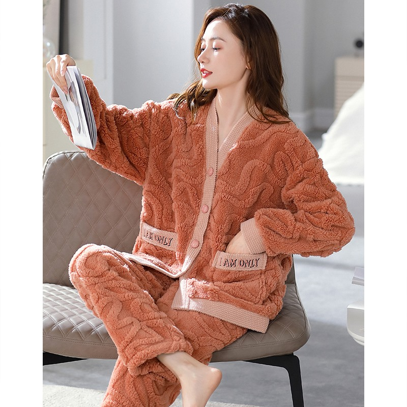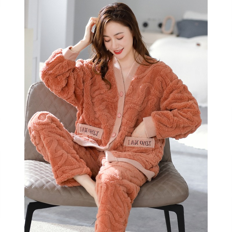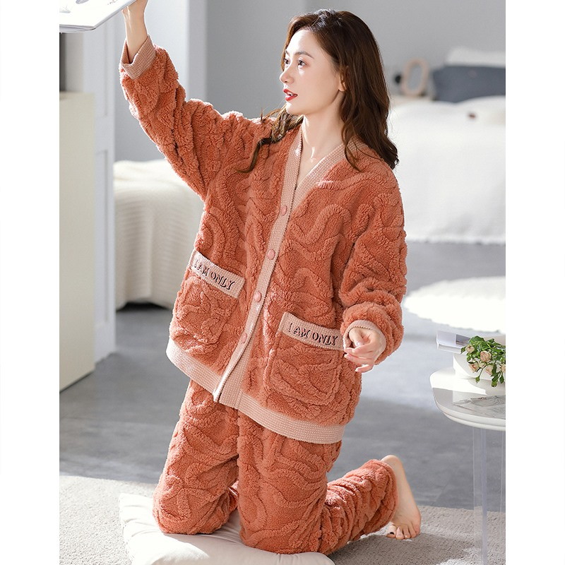 大码 家居服套装 加厚保暖 半边绒圆领长袖 安之伴珊瑚绒睡衣女秋冬季