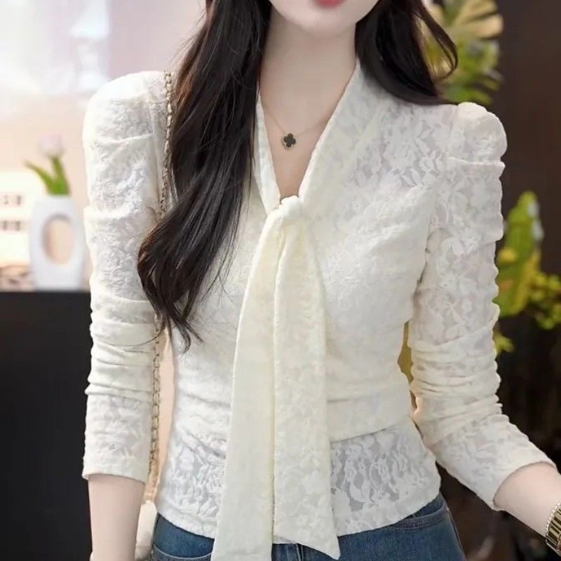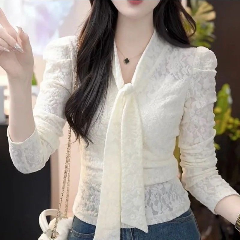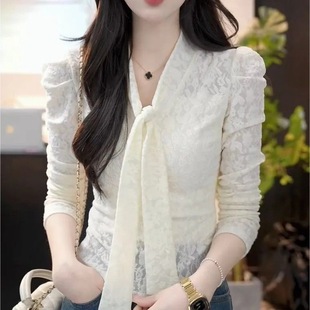 女长袖 气质女人味蝴蝶结蕾丝打底衫 洋气加绒加厚上衣 法式 秋冬新款