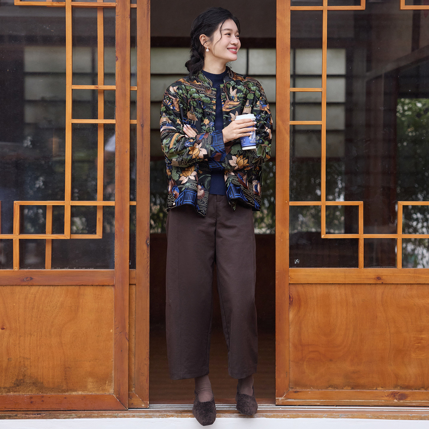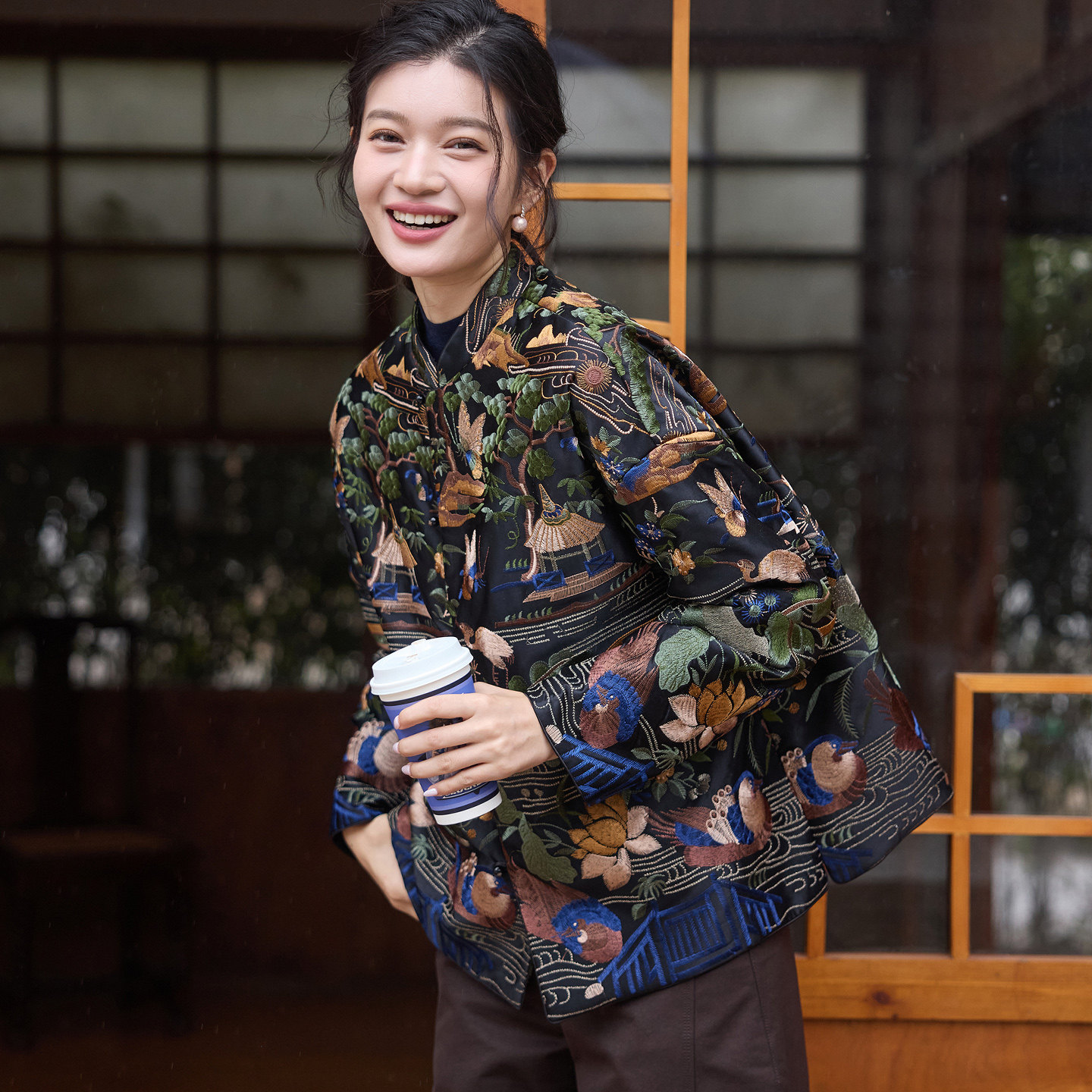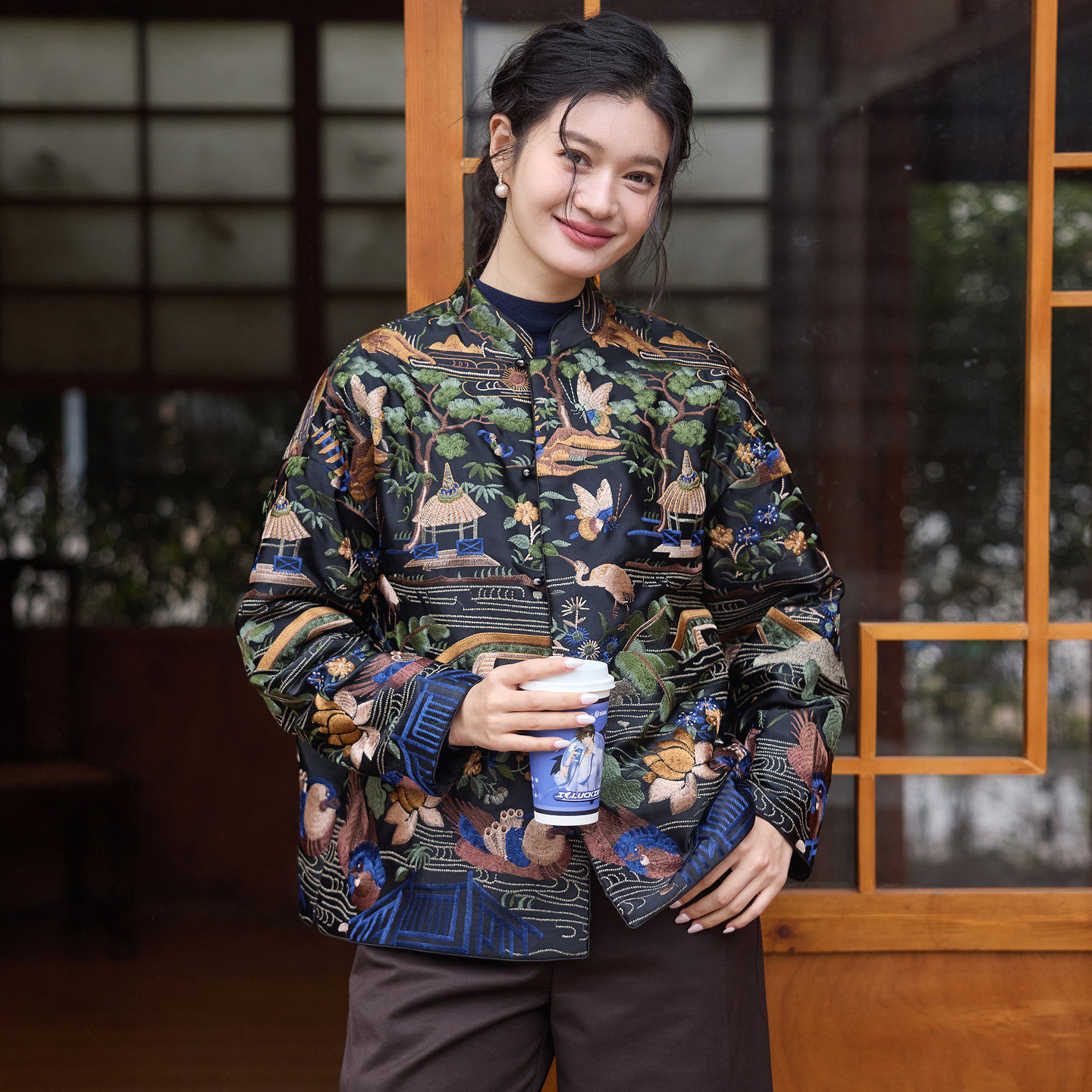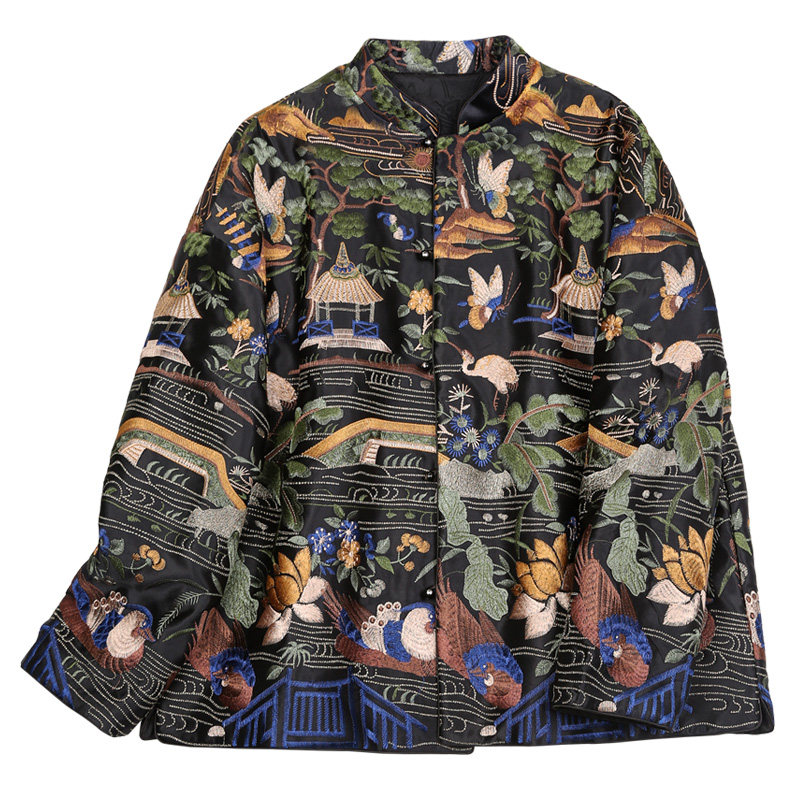 菲伊唐新中式 国潮复古改良真丝羊毛缎刺绣花立领古棉衣女上衣 唐装