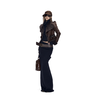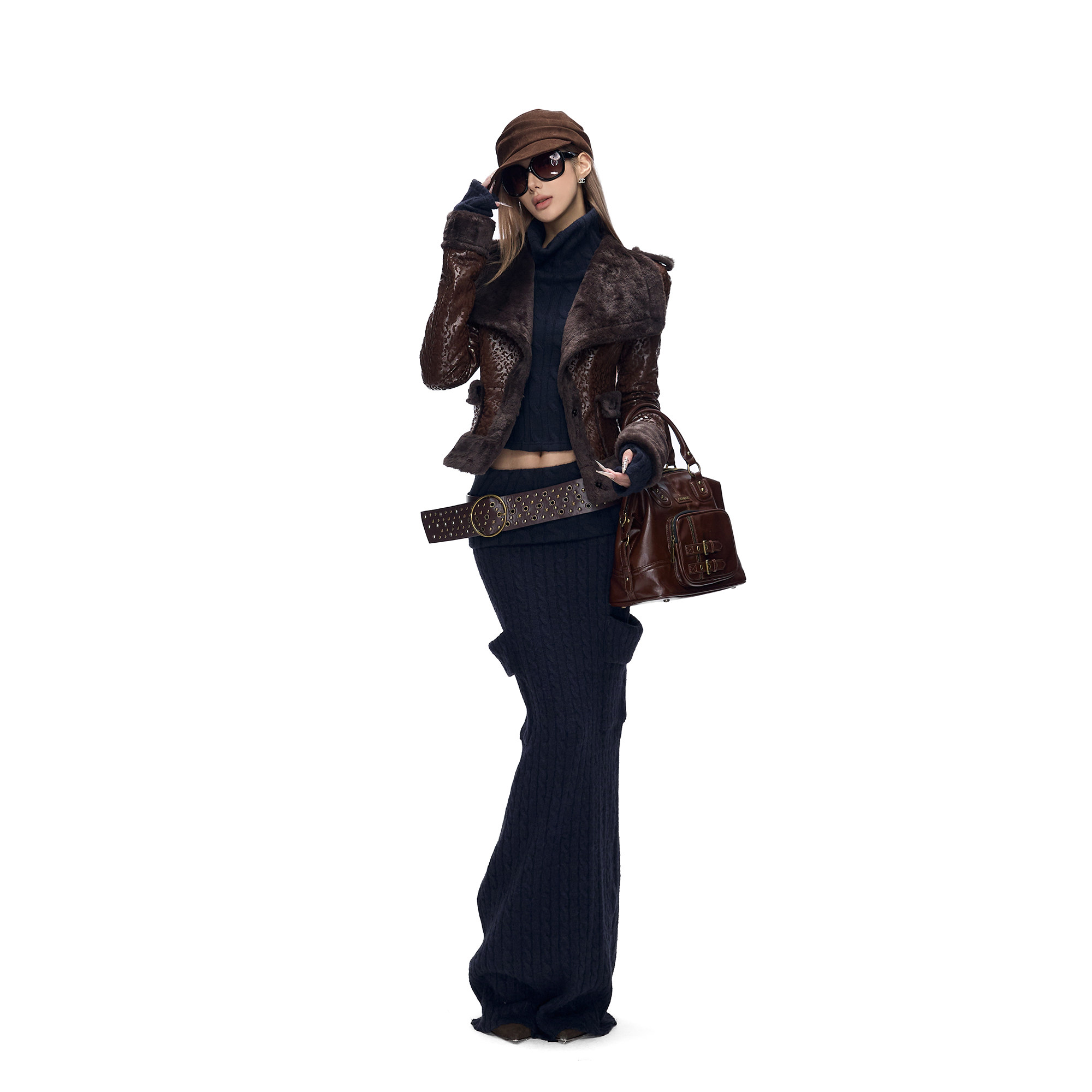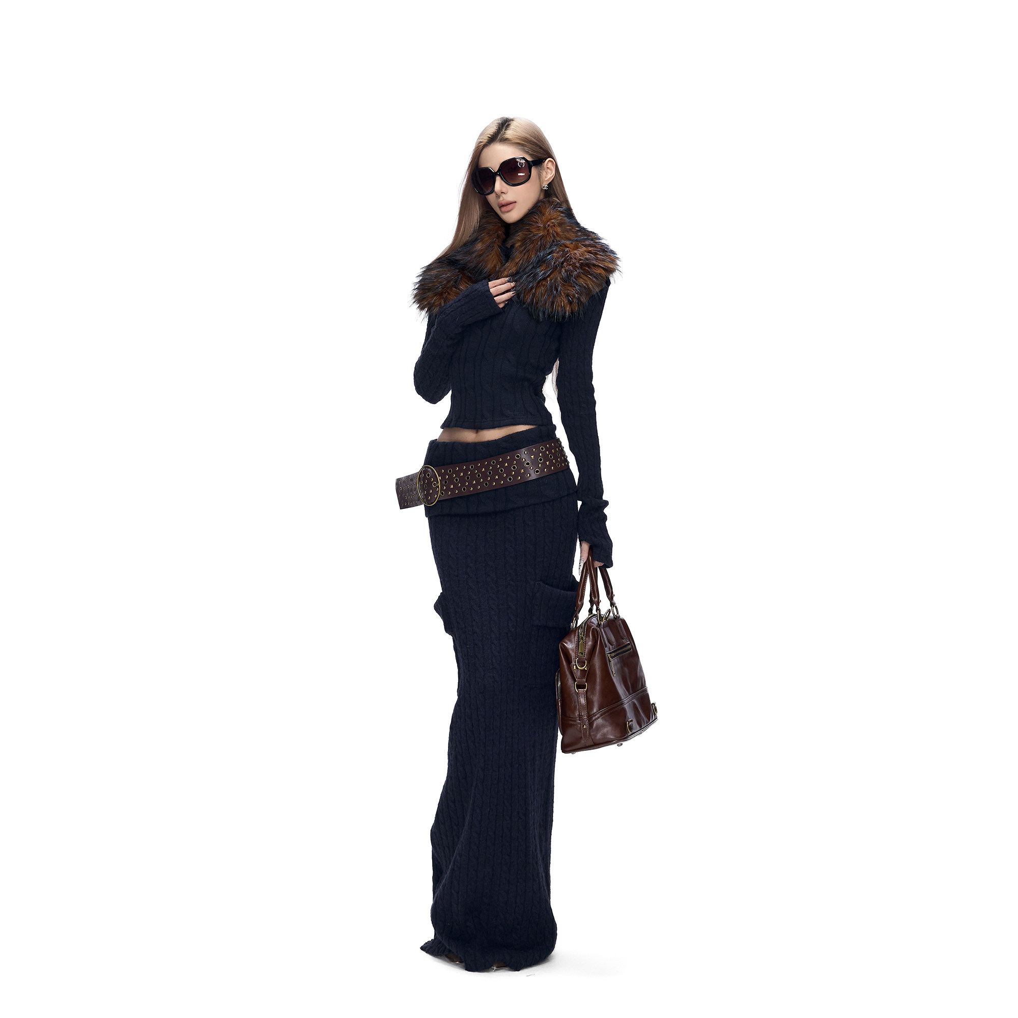 Fanptntox 藏青色麻花毛衣女软糯亲肤露肩上衣弹力针织半身裙套装