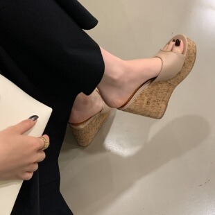 12cm辣妹一字带坡跟凉拖鞋 女2026春夏松糕木纹防水台露趾高跟鞋