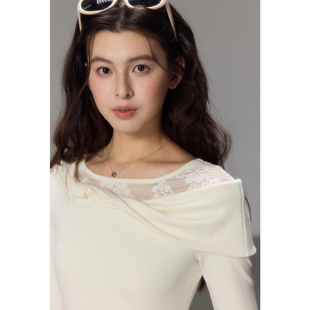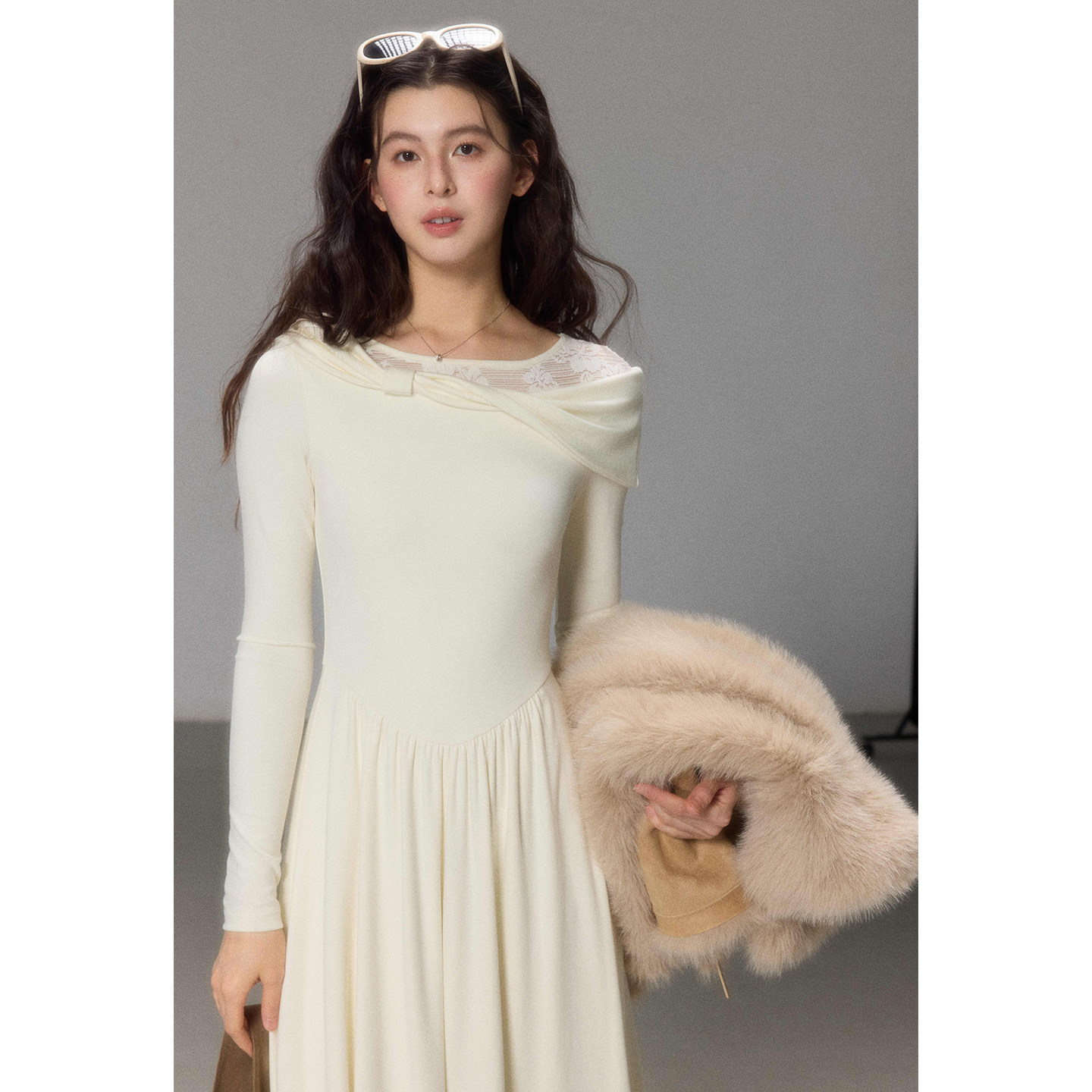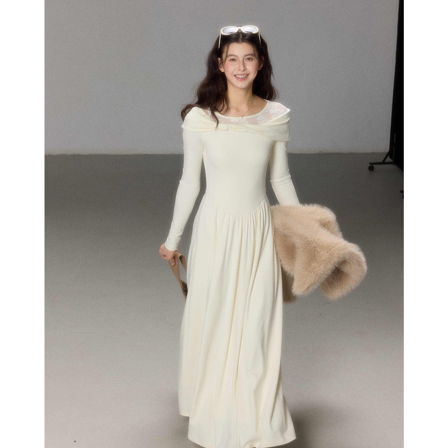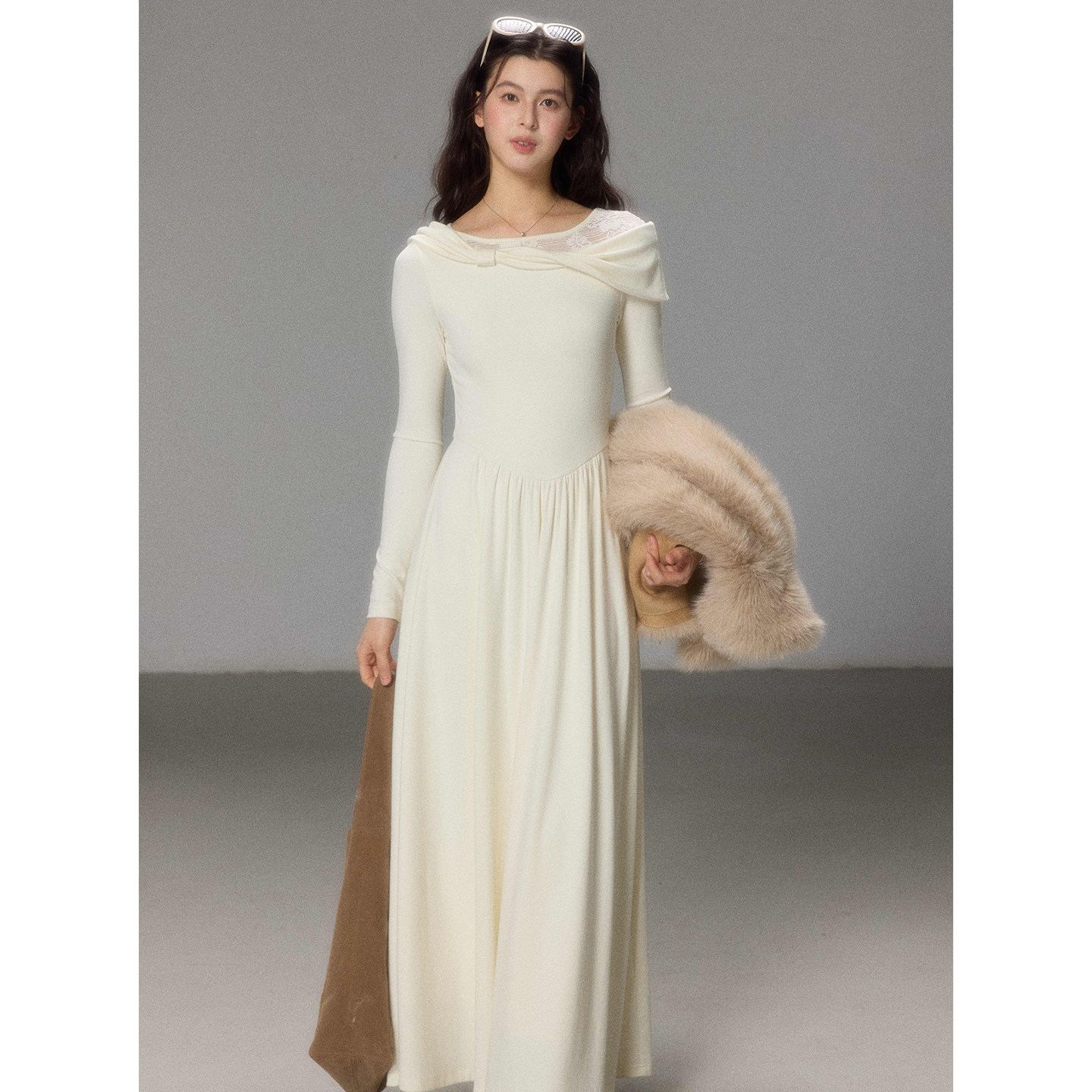 贰羊设计 高级感针织连衣裙女冬设计感斜领垂感大裙摆长裙 白茶
