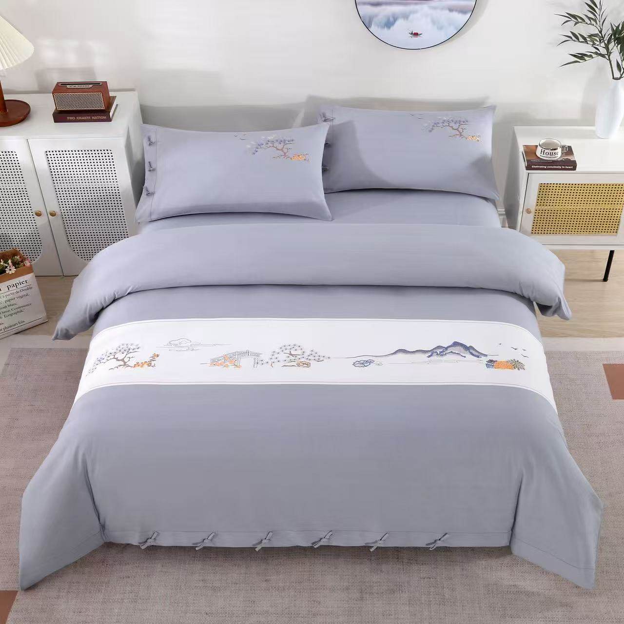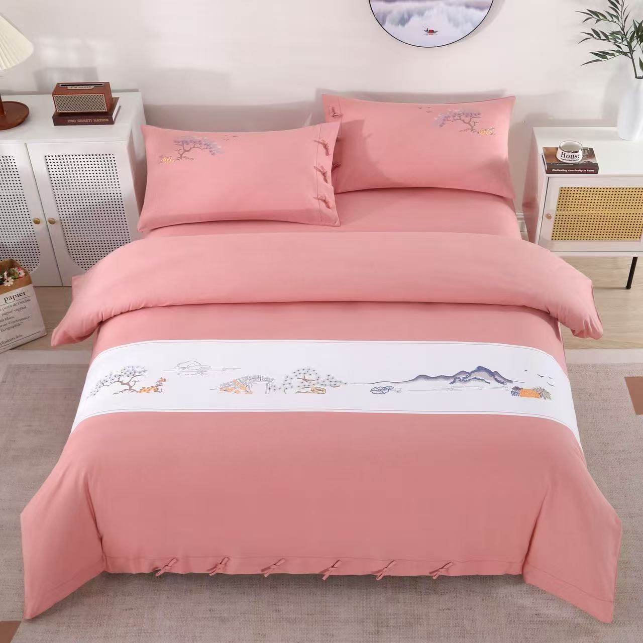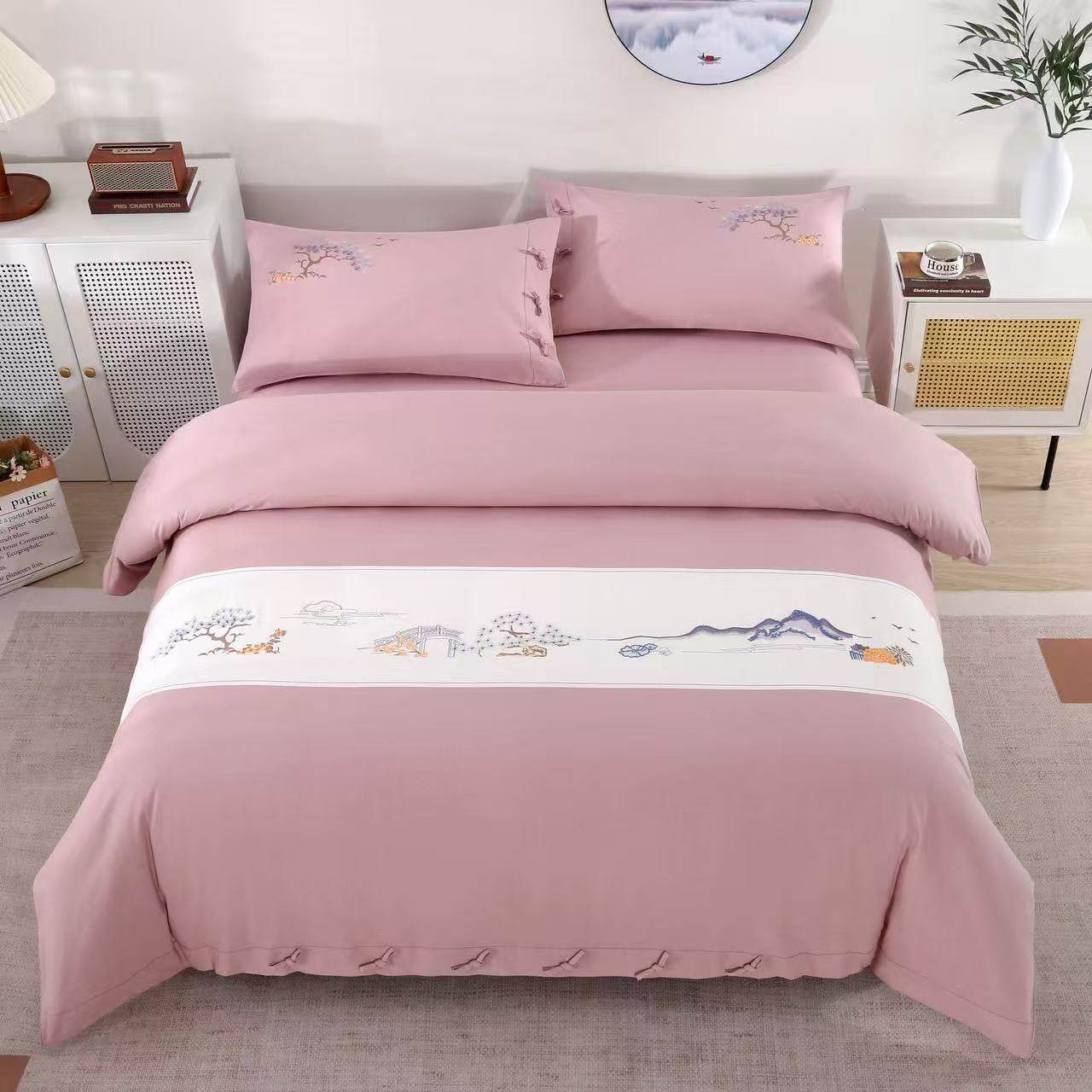 山东老粗布四件套高档刺绣全棉床单被套枕套纯棉床上四件套