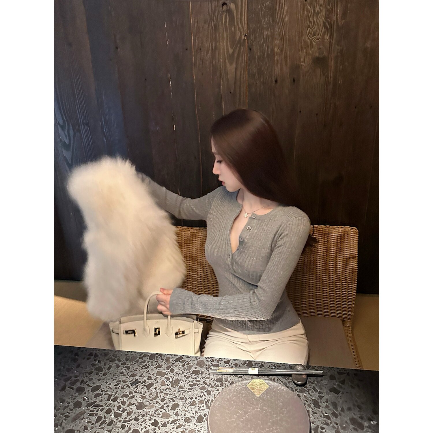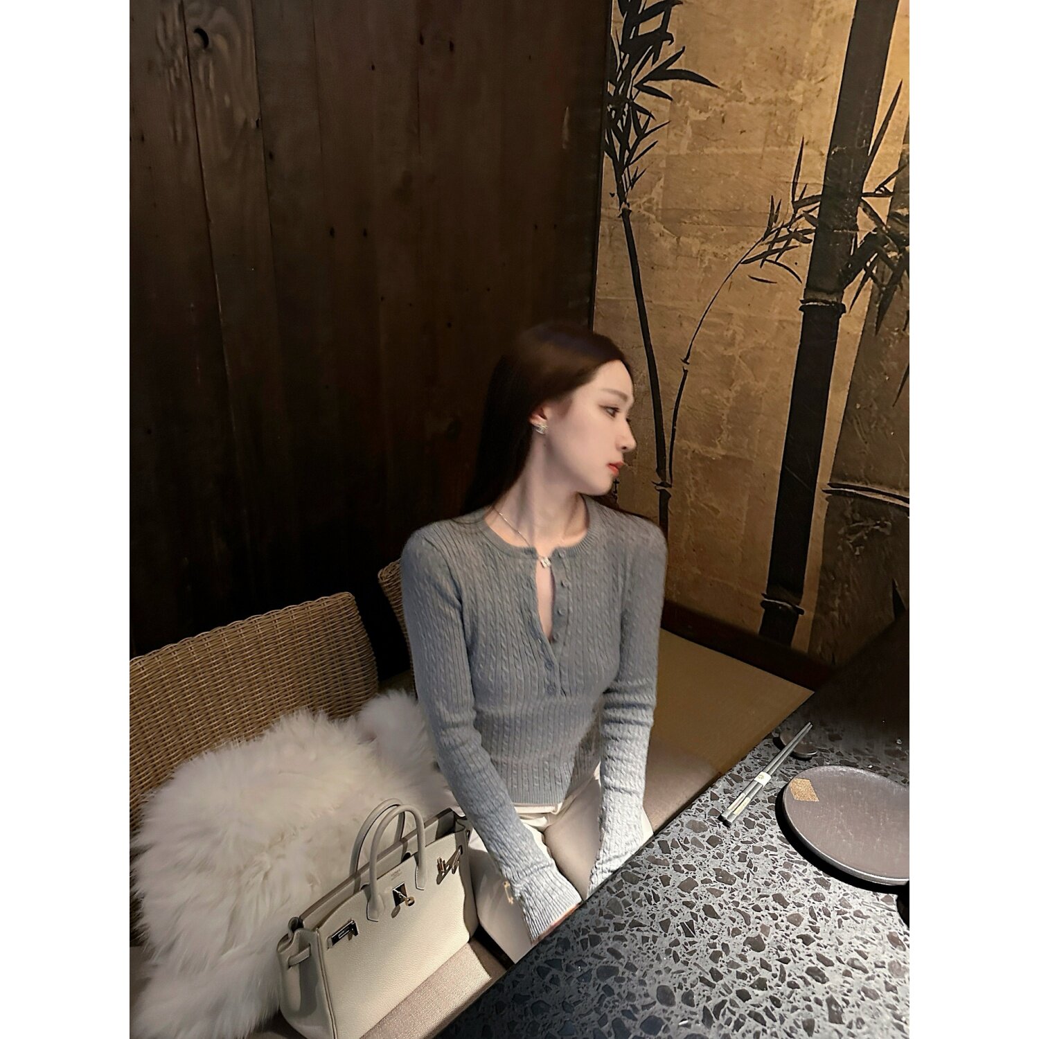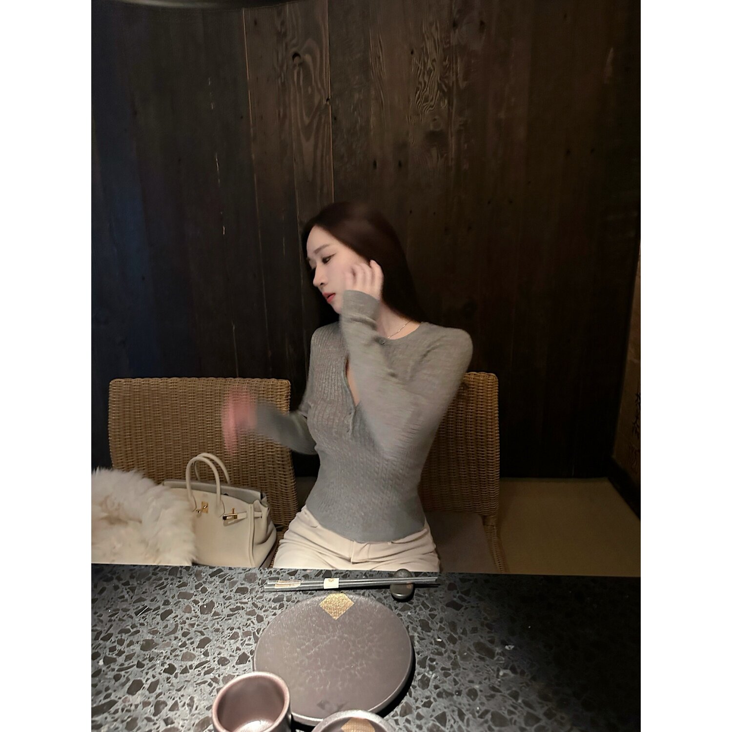 纯欲修身 禅意美人 zhazha 灰色V领麻花纹纽扣针织打底衫 Dear