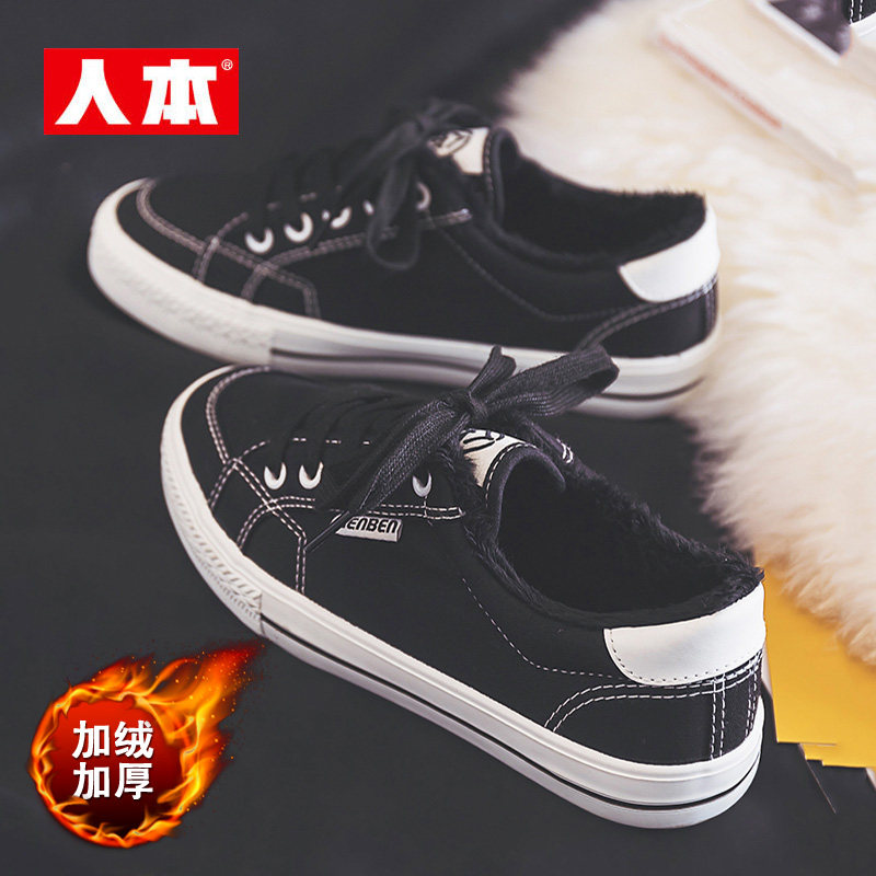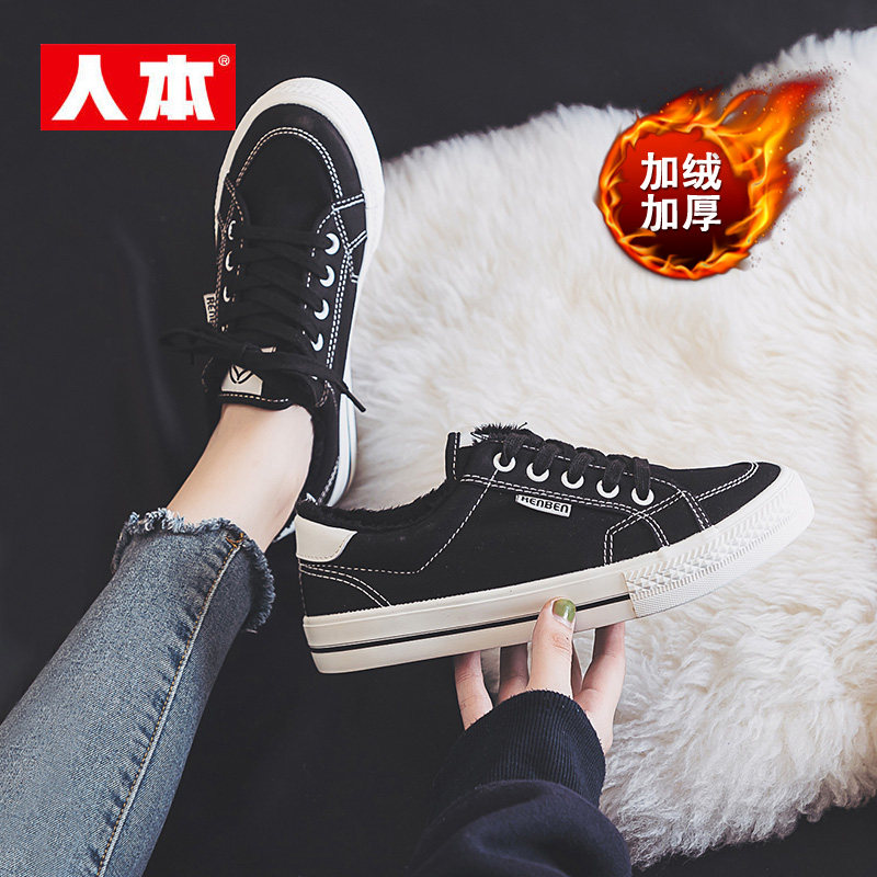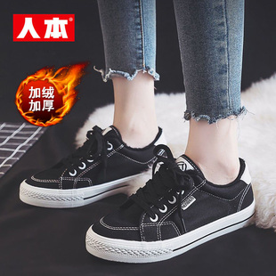 百搭轻便保暖板鞋 韩版 女秋冬黑色低帮平底休闲棉鞋 人本加绒帆布鞋