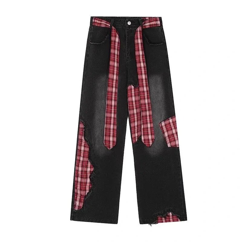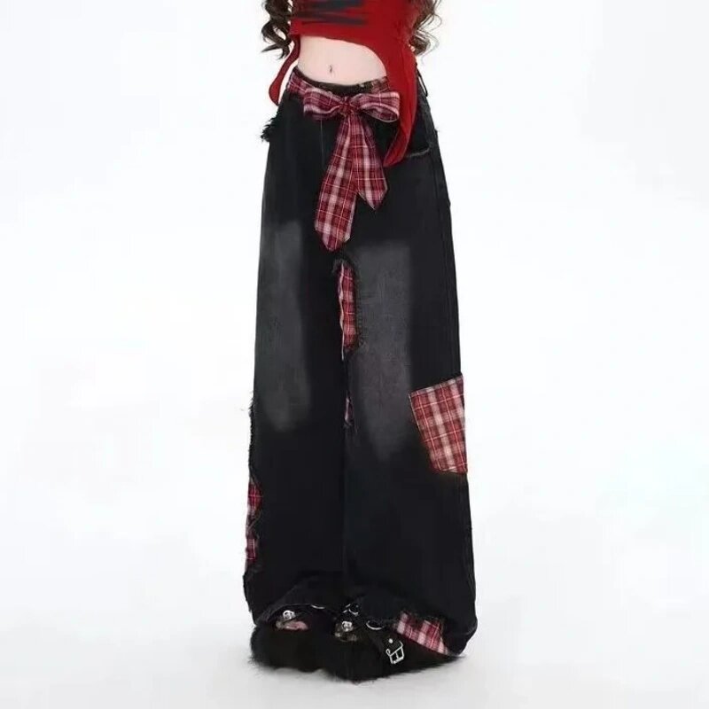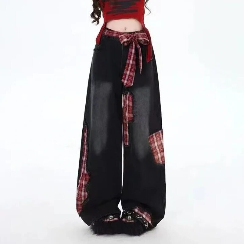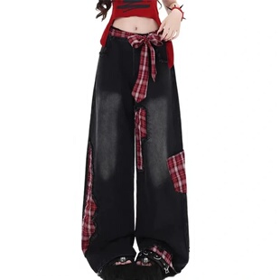 子 格子补丁设计宽松阔腿裤 黑色蝴蝶结绑带拼接牛仔裤 女2025年秋季