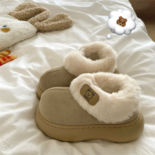 外穿雪地靴 女ins厚底冬季 小熊木屋 巨厚加绒保暖包跟毛毛棉拖鞋
