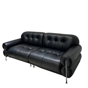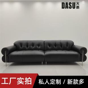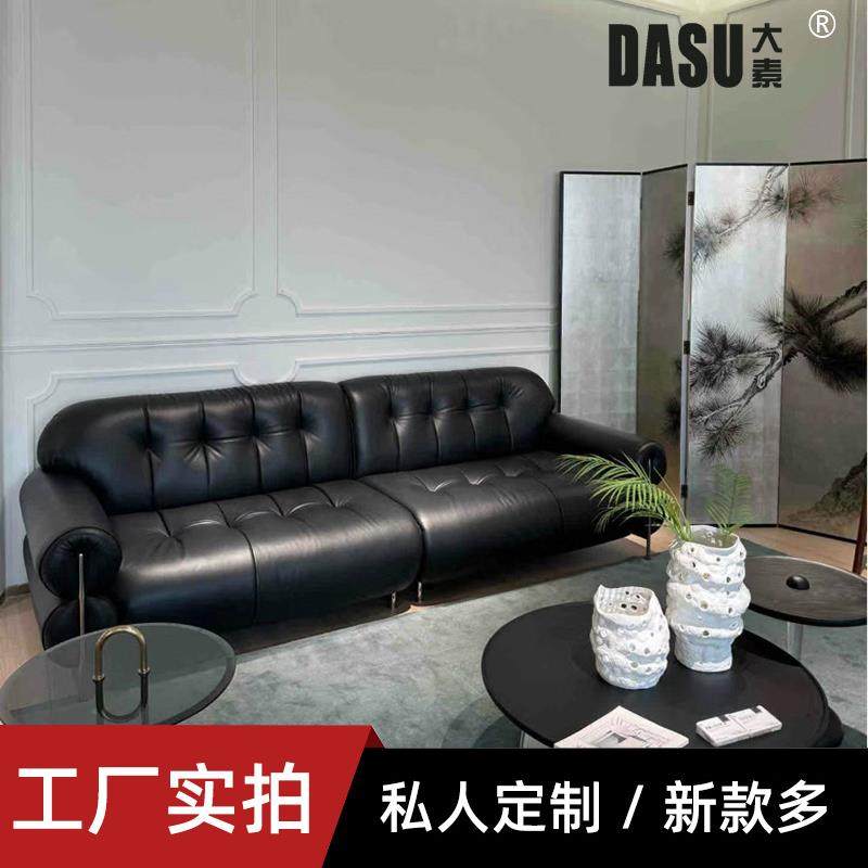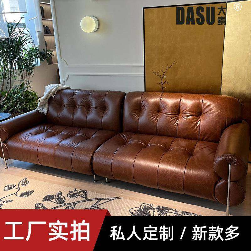 黑糖云朵沙发中古风油蜡皮极简直排设计师高脚美式 小户型复古沙发