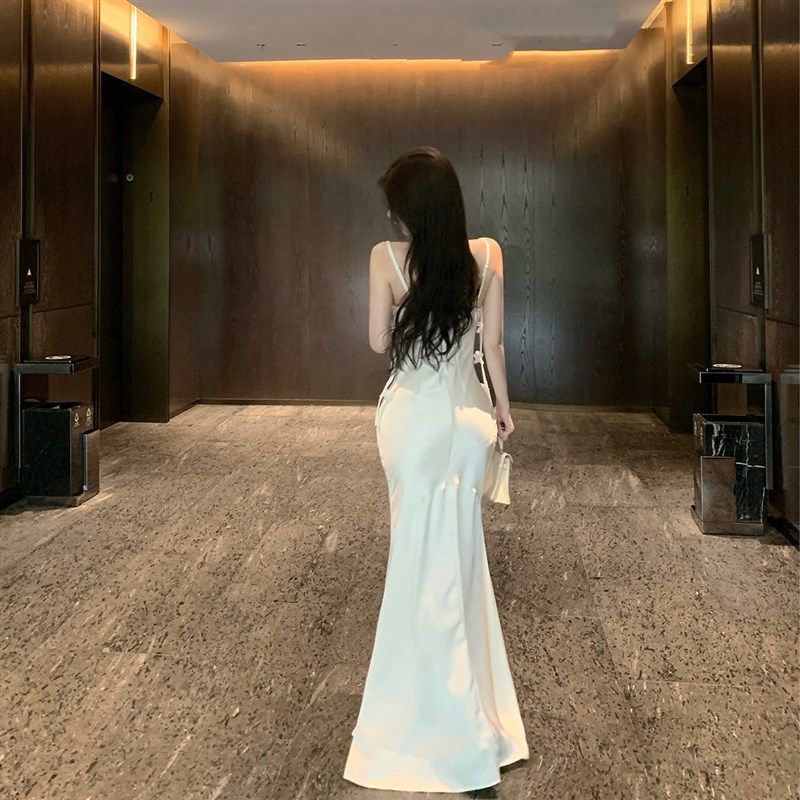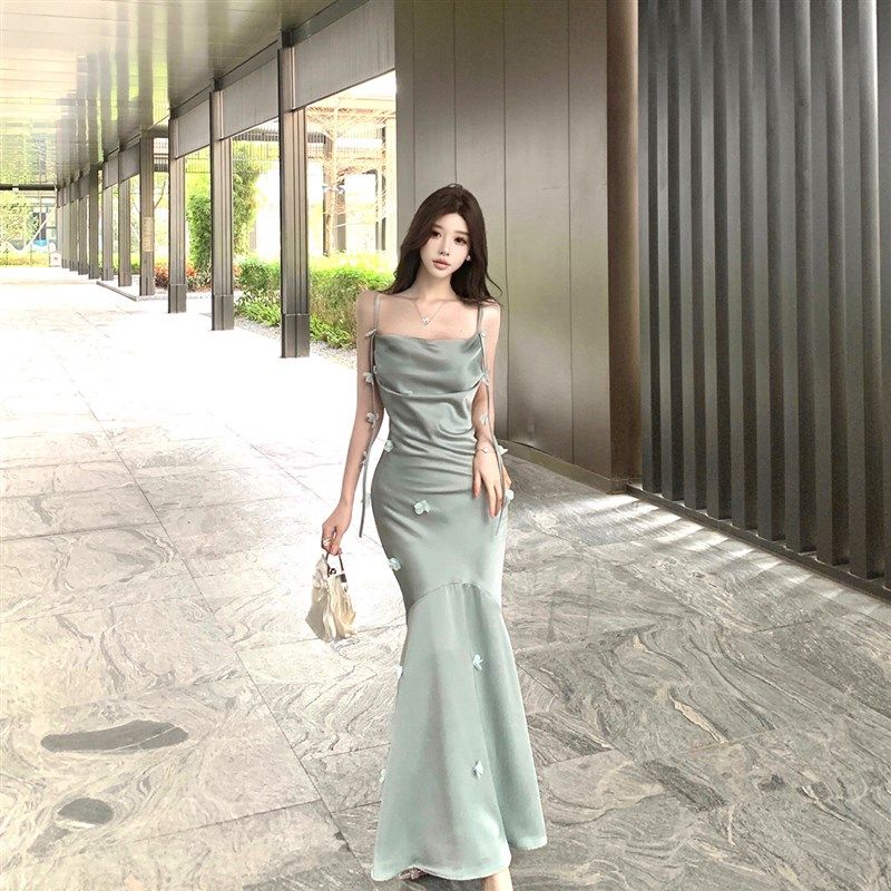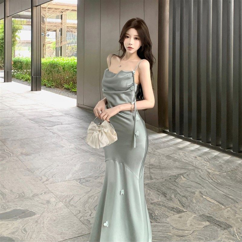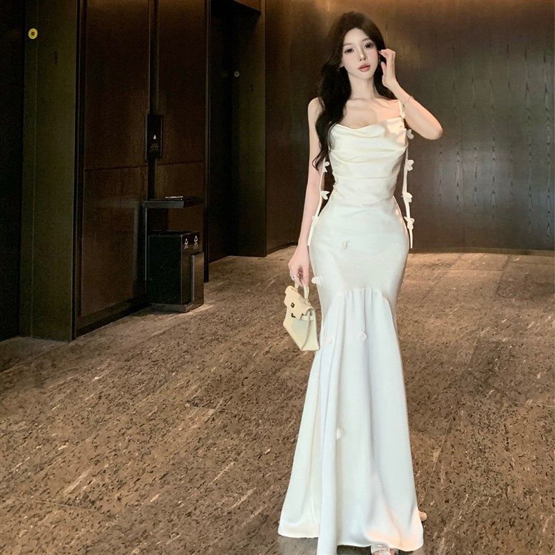 法式 高级感荡领醋酸缎面连衣裙女设计感立体花瓣飘带收腰吊带长裙