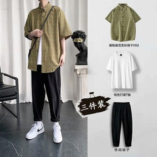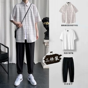 夏季 一套搭配帅气衬衫 薄款 男装 三件套2021年夏款 轻熟风小个子套装