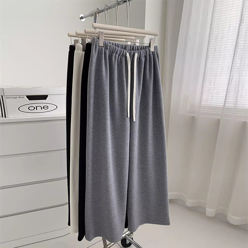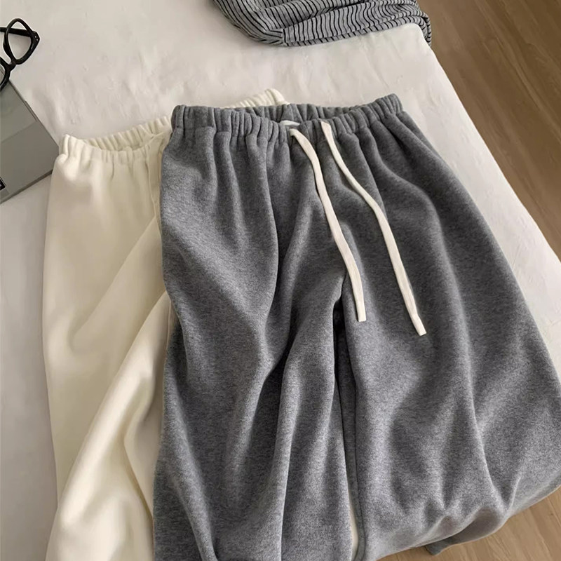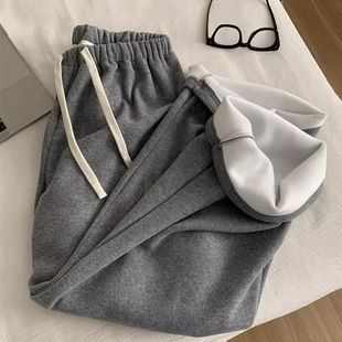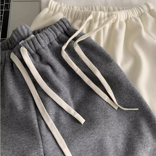抽绳宽松休闲长裤 女加绒外穿阔腿裤 加厚小个子150灰色糯米裤 冬季