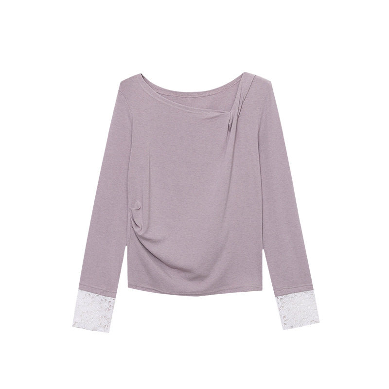 口打底衫 法式 女款 新款 设计感假两件T恤 2026春季 不规则斜领蕾丝袖
