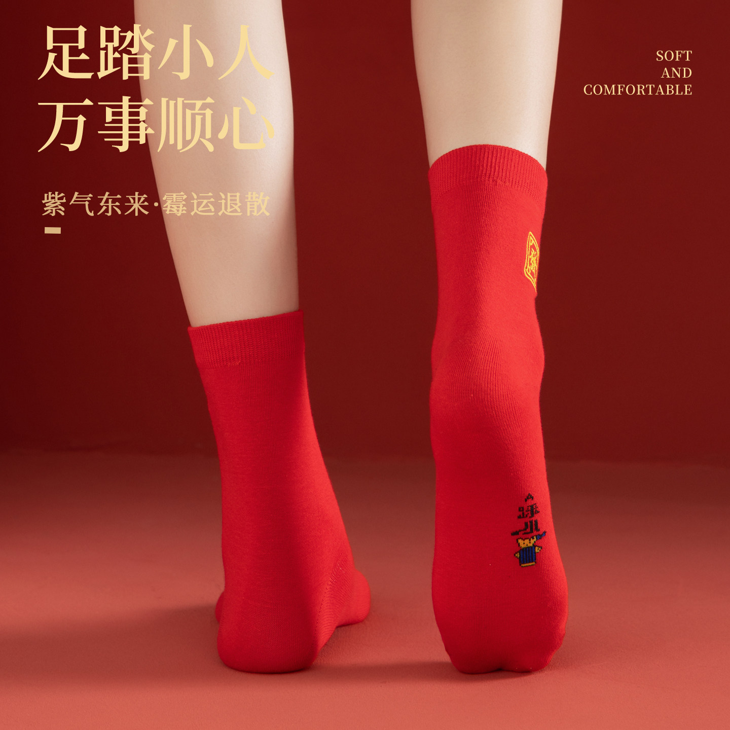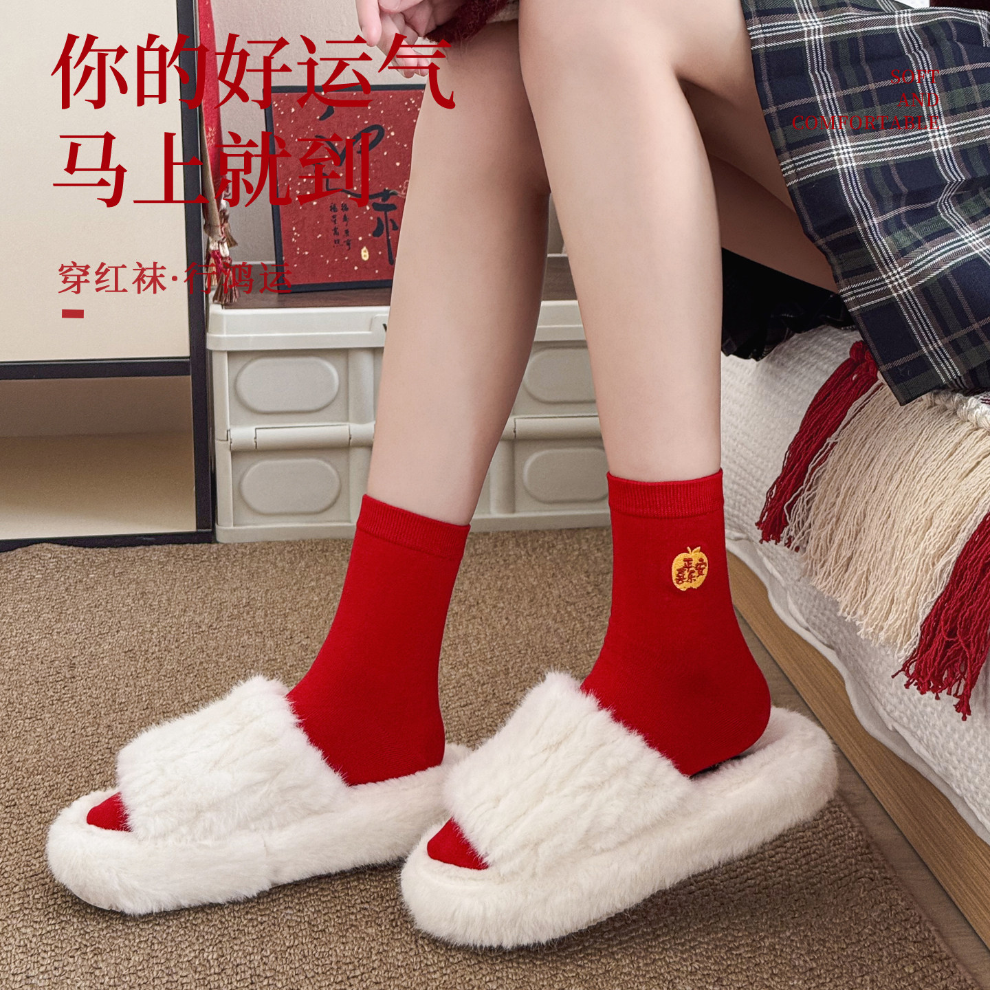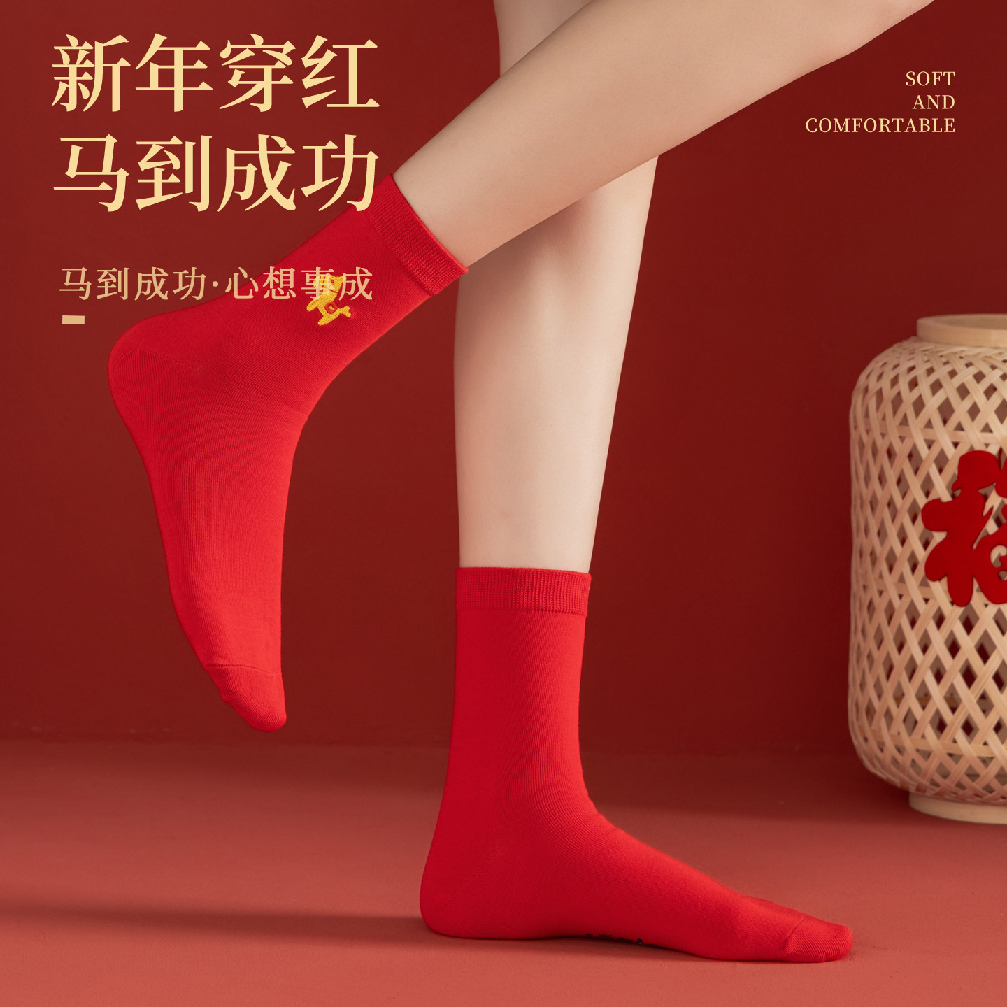 2026马年本命年红色袜子女款 秋冬中筒袜刺绣结婚情侣新年礼物长袜