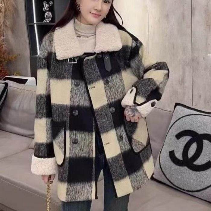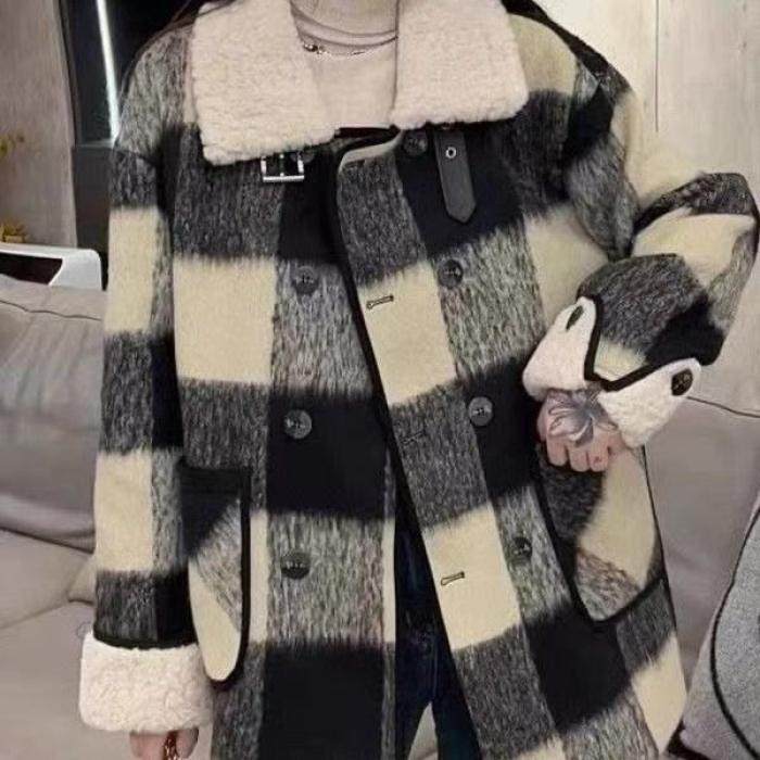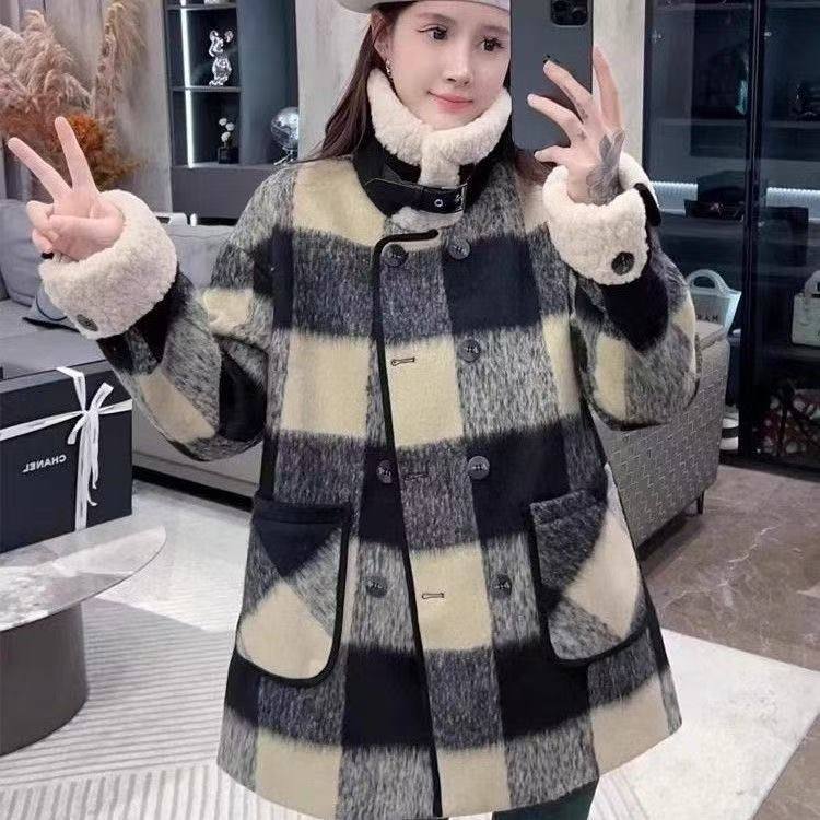 胖MM遮肉大衣 大码 加棉加厚格子拼接韩系显瘦毛呢外套2024新款 冬季