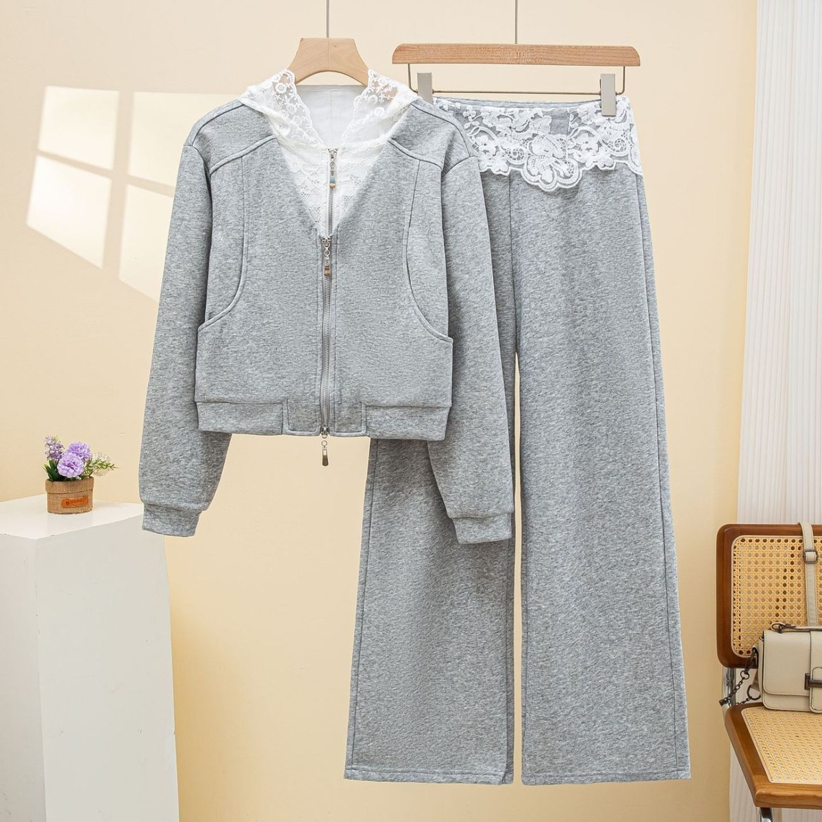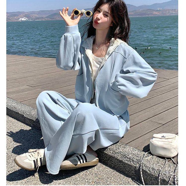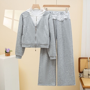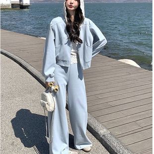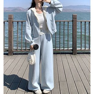 休闲运动蕾丝花边连帽蓝色卫衣套装 两件套洋气高级感 女春秋阔腿裤