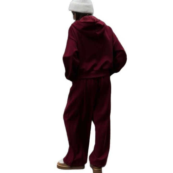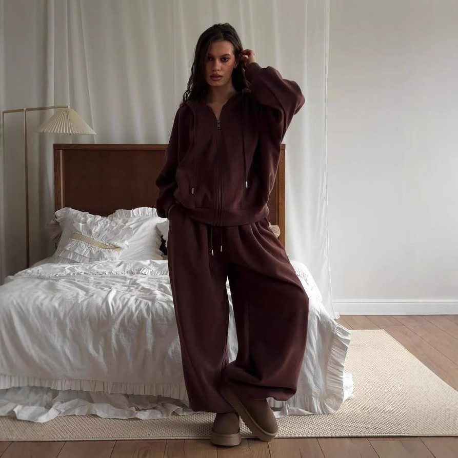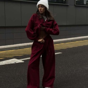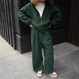 欧美风女装 两件套纯色女装 休闲长袖 长裤 棉质 连帽运动开衫 时尚