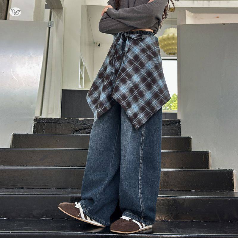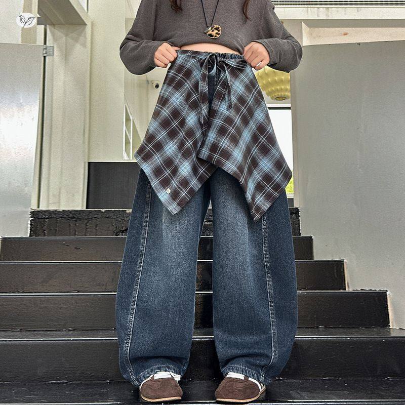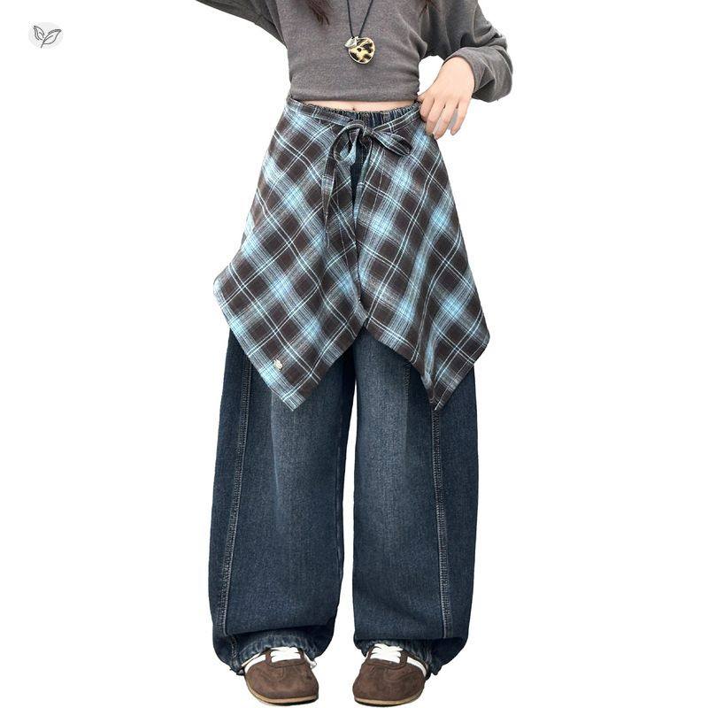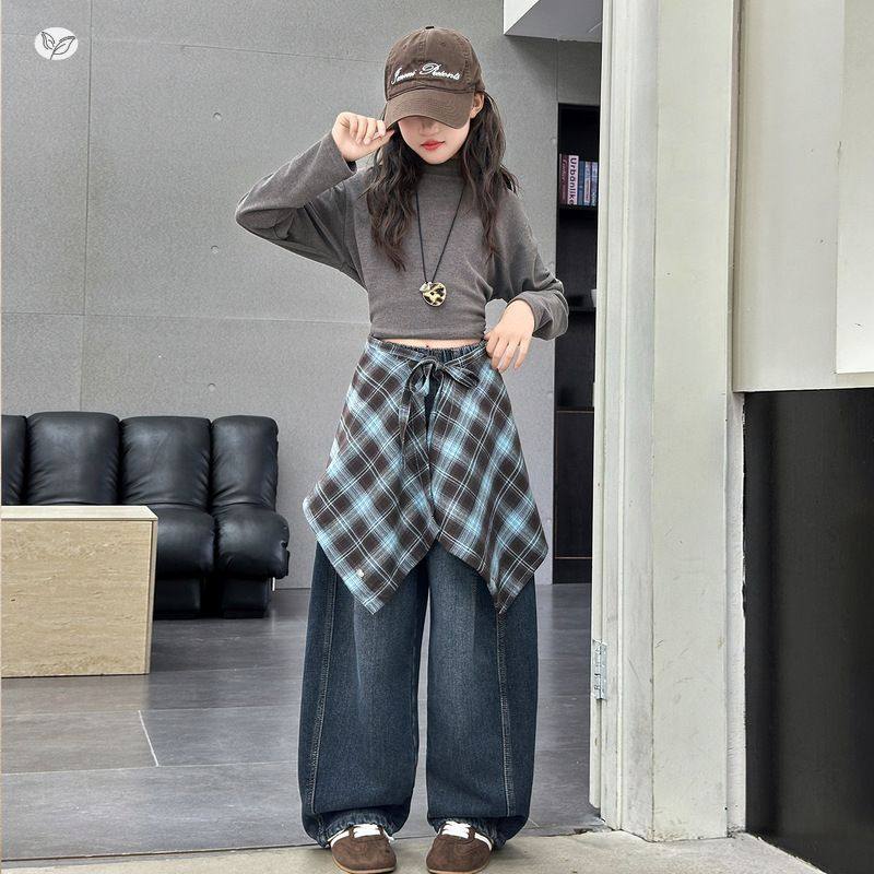 长裤 女童秋冬加绒牛仔裤 冬装 阔腿裤 2025中大童时髦格子屁帘弯刀裤