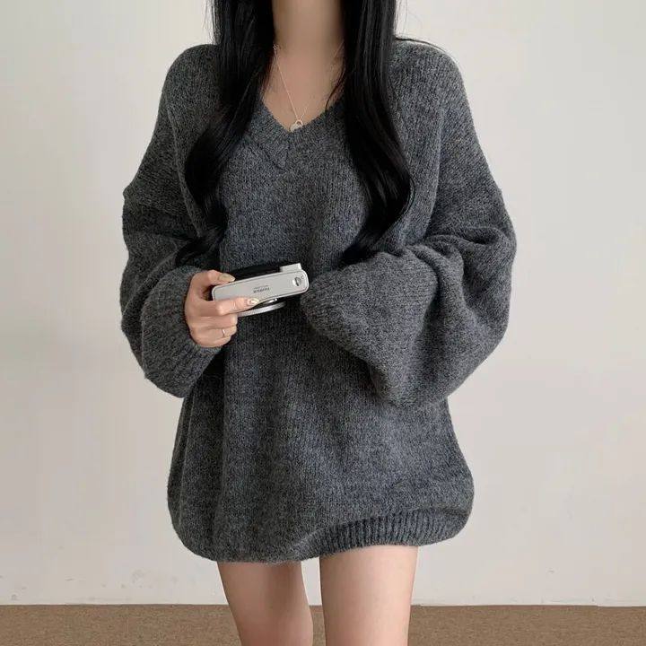 圆领100%纯山羊绒衫 灰色宽松打底上衣 女毛衣秋冬假两件拼色针织衫