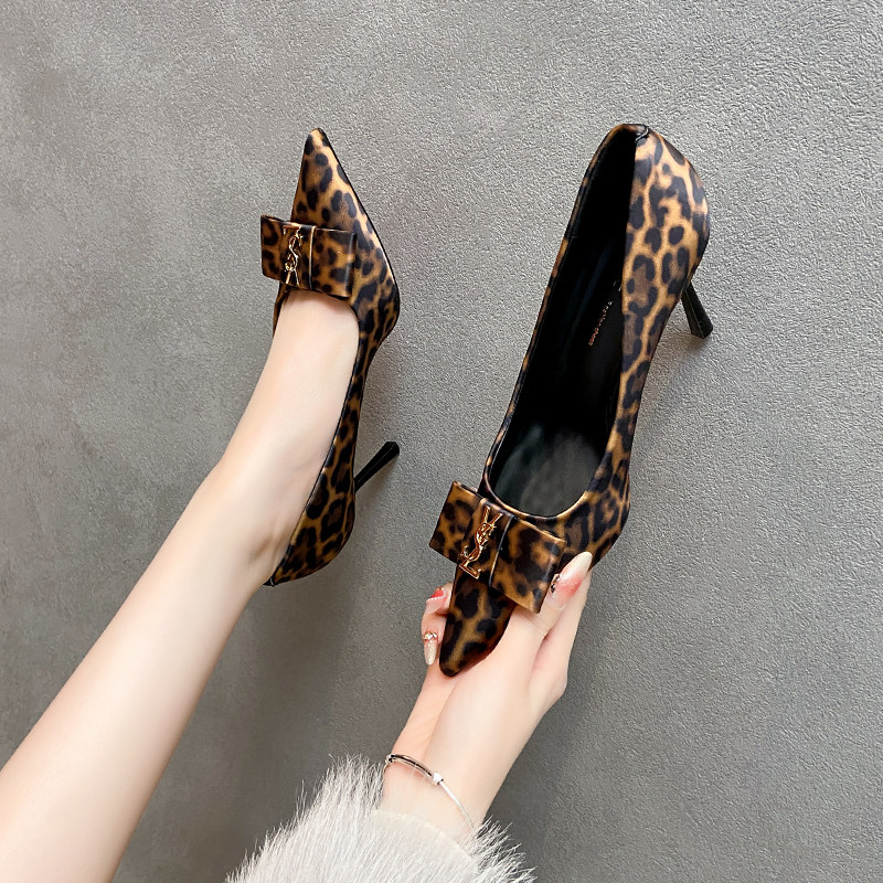 细跟通勤性感蝴蝶结小豹纹女缎面高跟鞋 不累脚 尖头浅口百搭单鞋