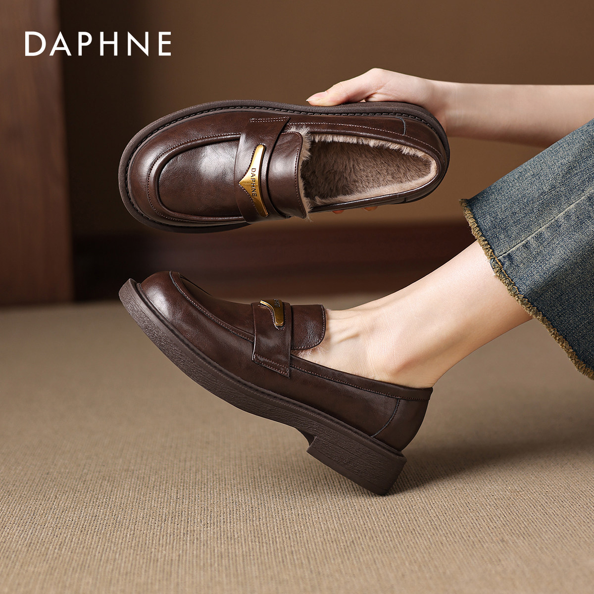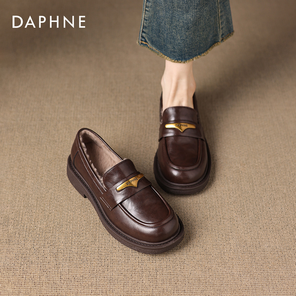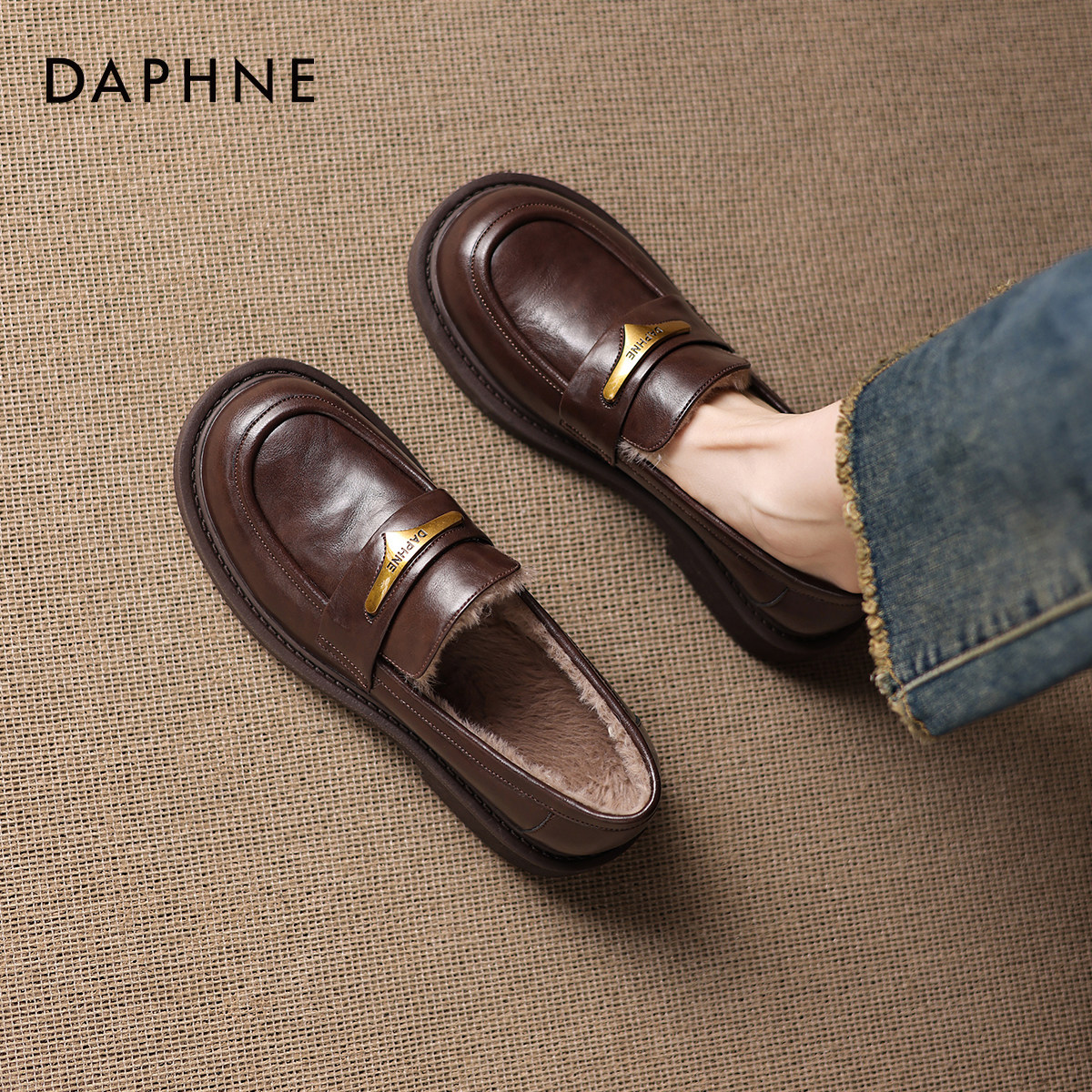 女2026新款 英伦单鞋 冬一脚蹬厚底皮鞋 棉鞋 毛毛鞋 达芙妮加绒乐福鞋