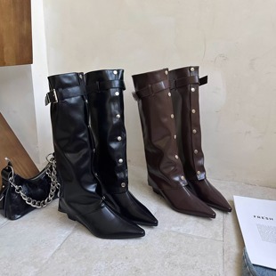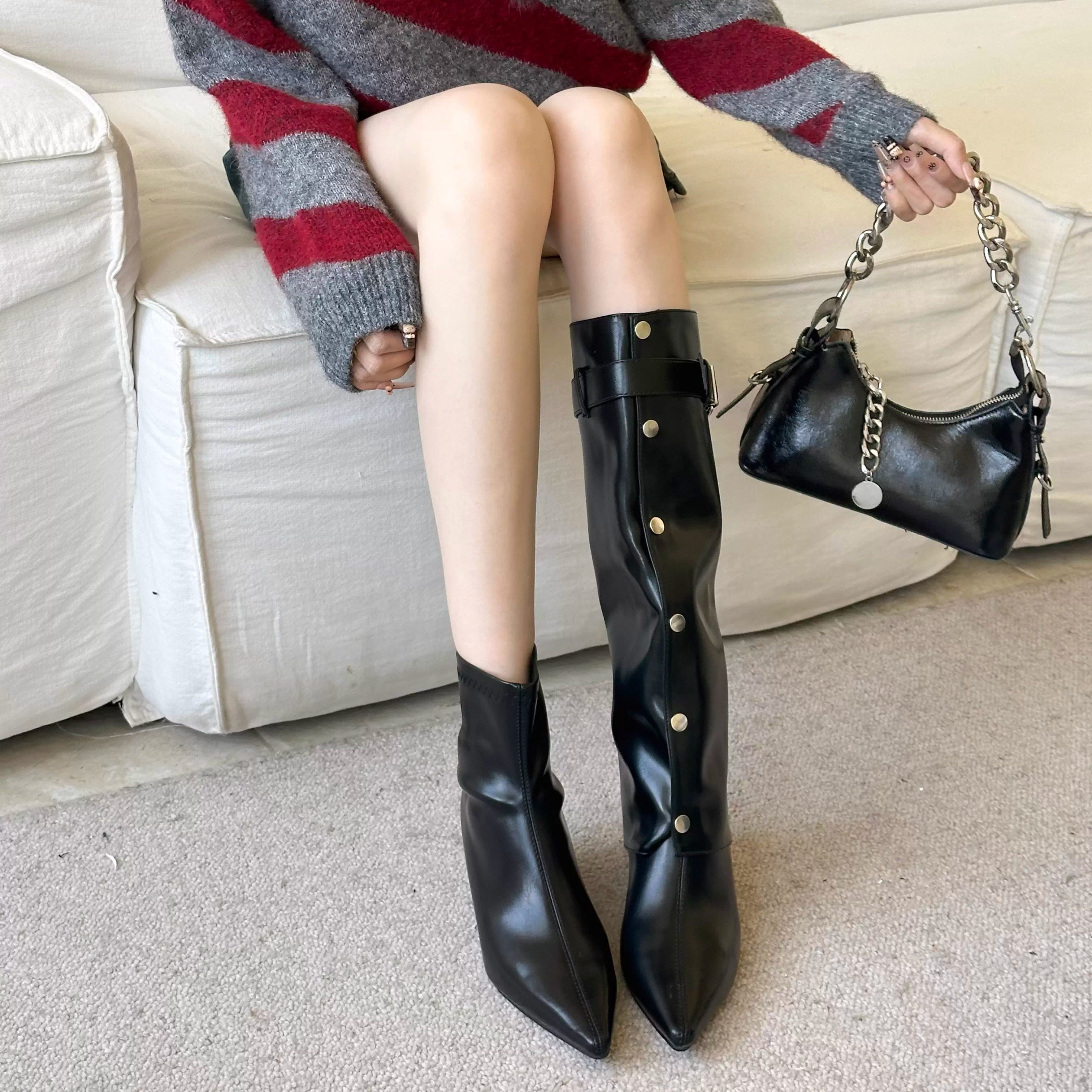 马丁靴 瘦瘦靴后拉链复古粗跟时装 法式 尖头高跟短靴女2025秋冬新款
