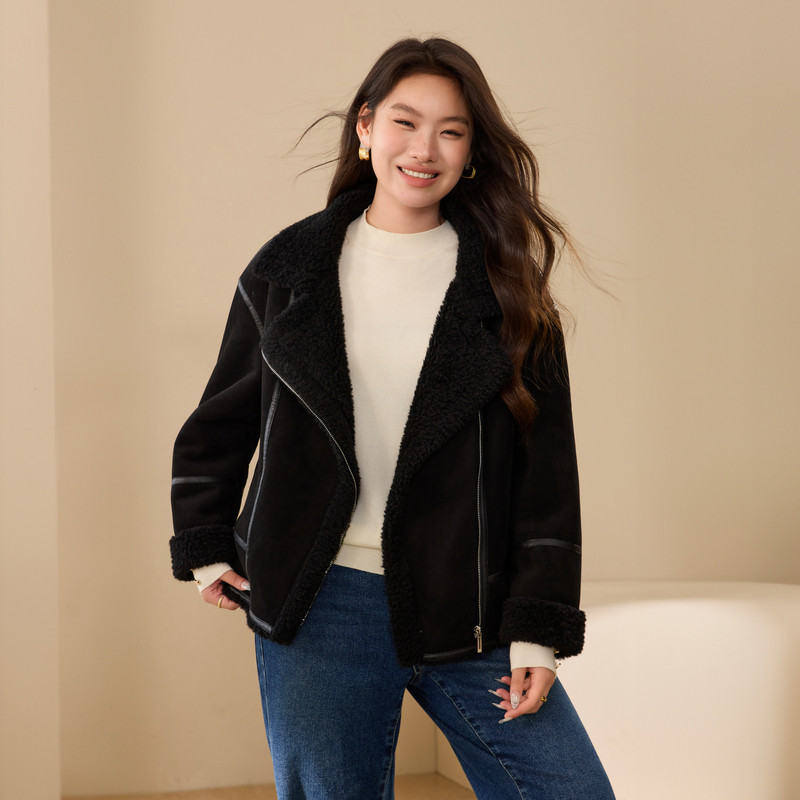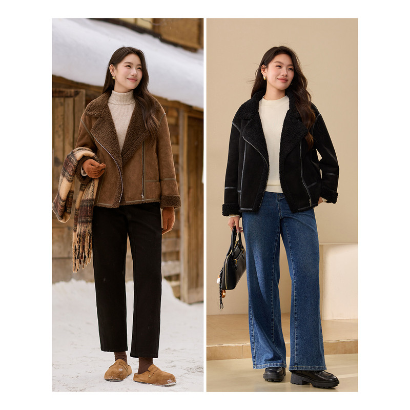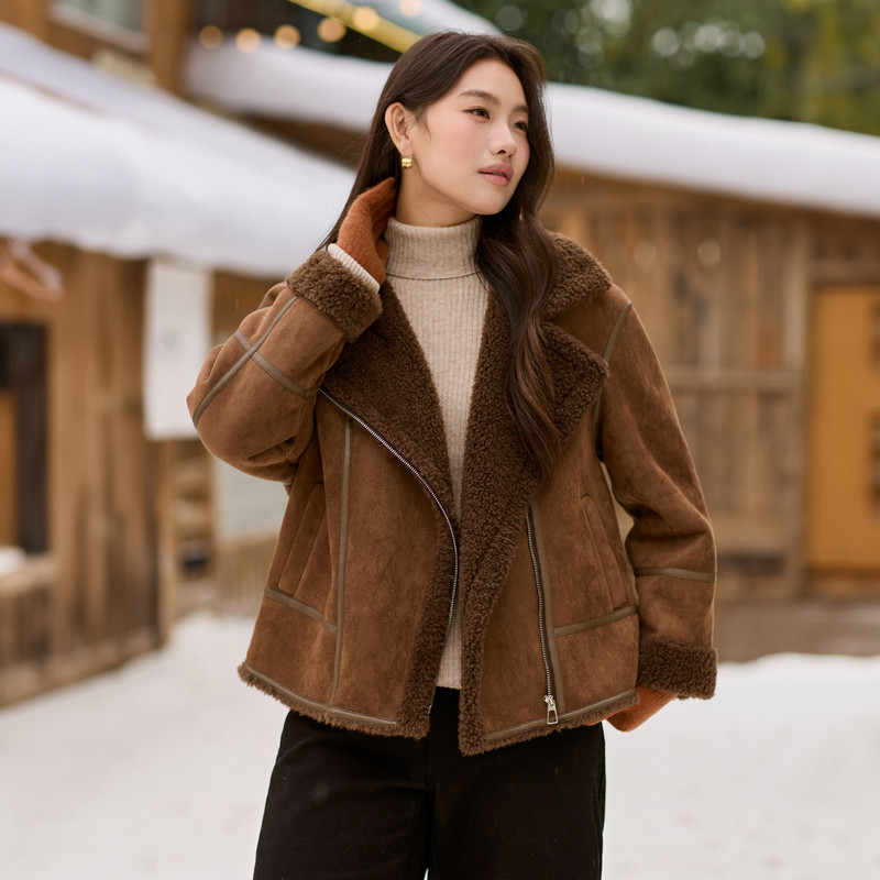 胖mm2025冬装 女装 纤莉秀大码 新款 加绒加厚皮毛一体麂皮绒外套