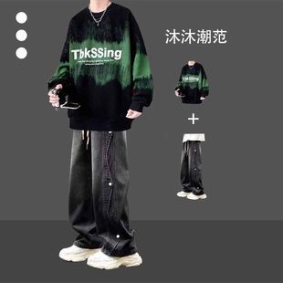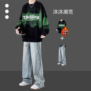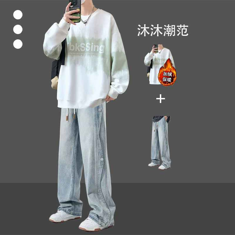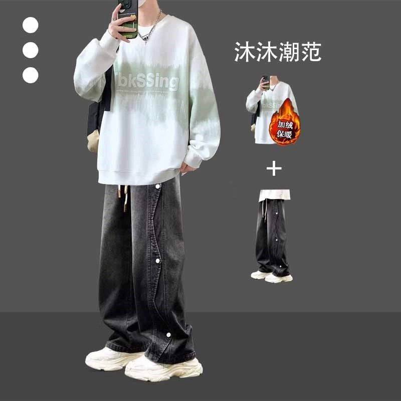 两件套 潮流设计感大学生一套搭配炸街牛仔裤 圆领卫衣男款 秋冬套装