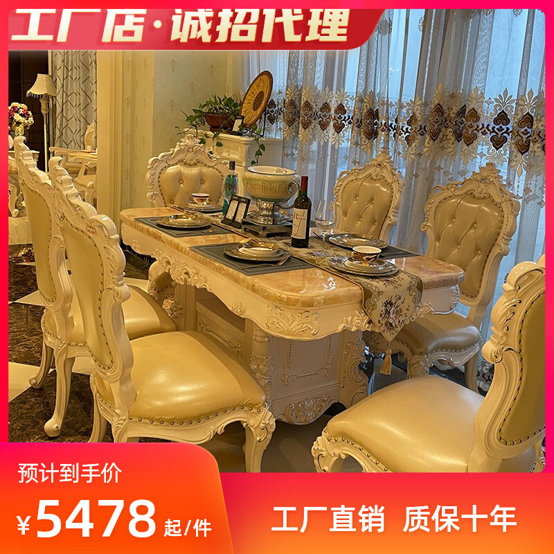 奢华欧式 六椅组合 大理石餐桌储物长方形实木雕花天然饭厅一桌四
