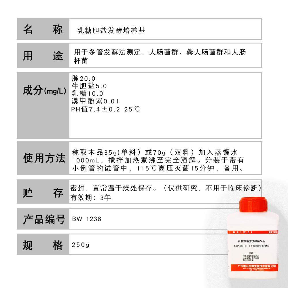 多管发酵法 瓶 大肠菌群粪大肠菌群 250g 百微乳糖胆盐发酵培养基