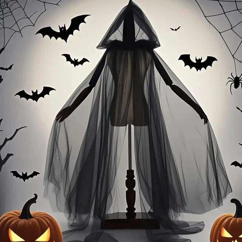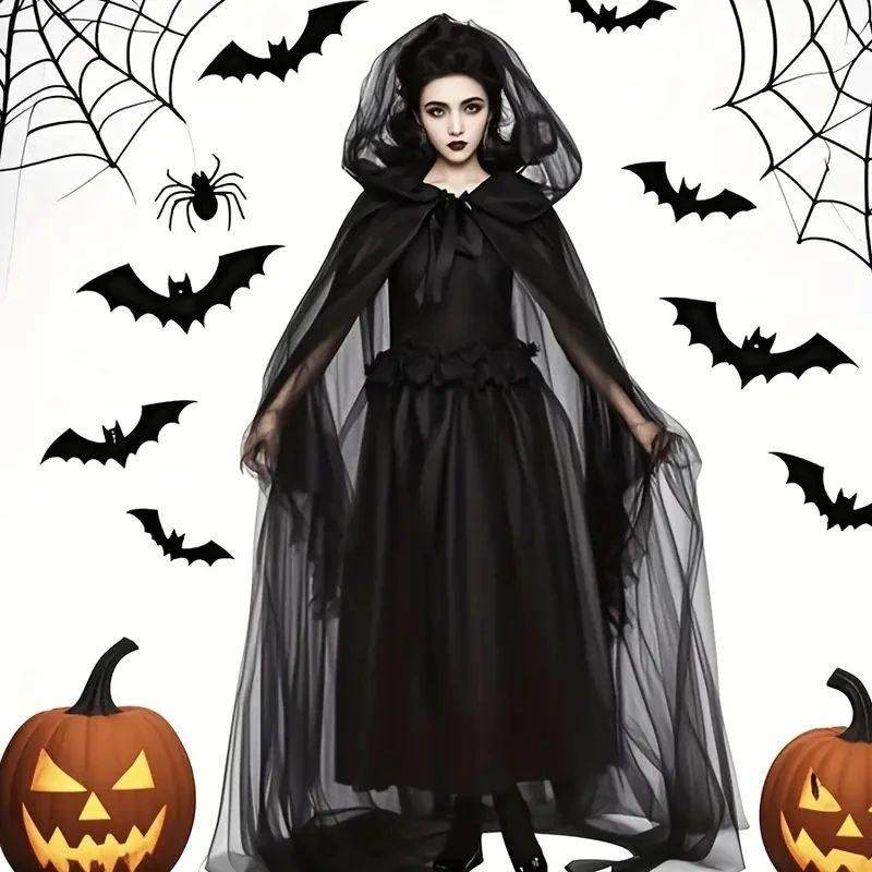 Elegant Sheer Mesh Halloween with Cape Cloak Drawstri Hooded