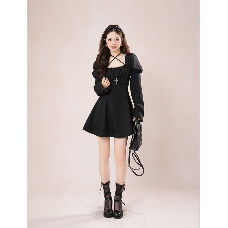 哥特风黑色蕾丝泡泡长袖 新款 系带收腰设计感连衣裙 秋季 十字夜宴