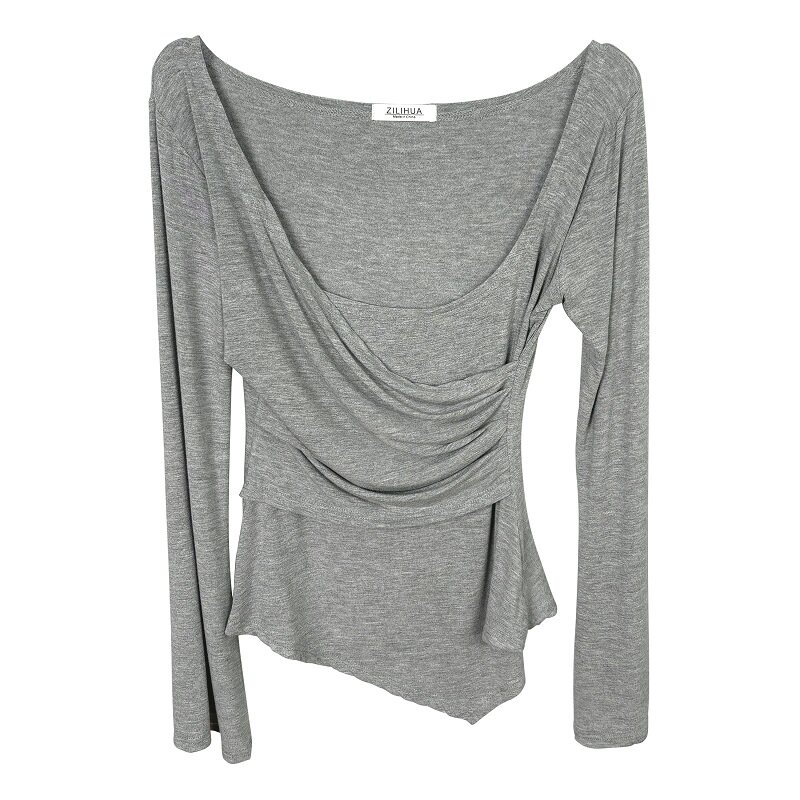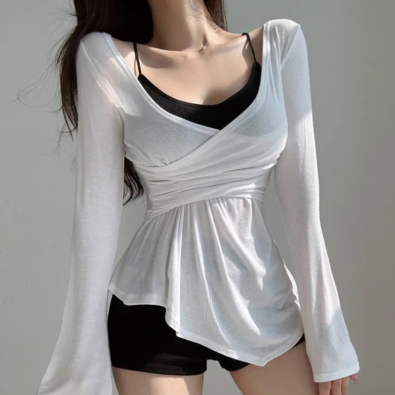锁骨纯欲上衣 收腰打底衫 性感V领交叉褶皱长袖 t恤女春秋心机喇叭袖