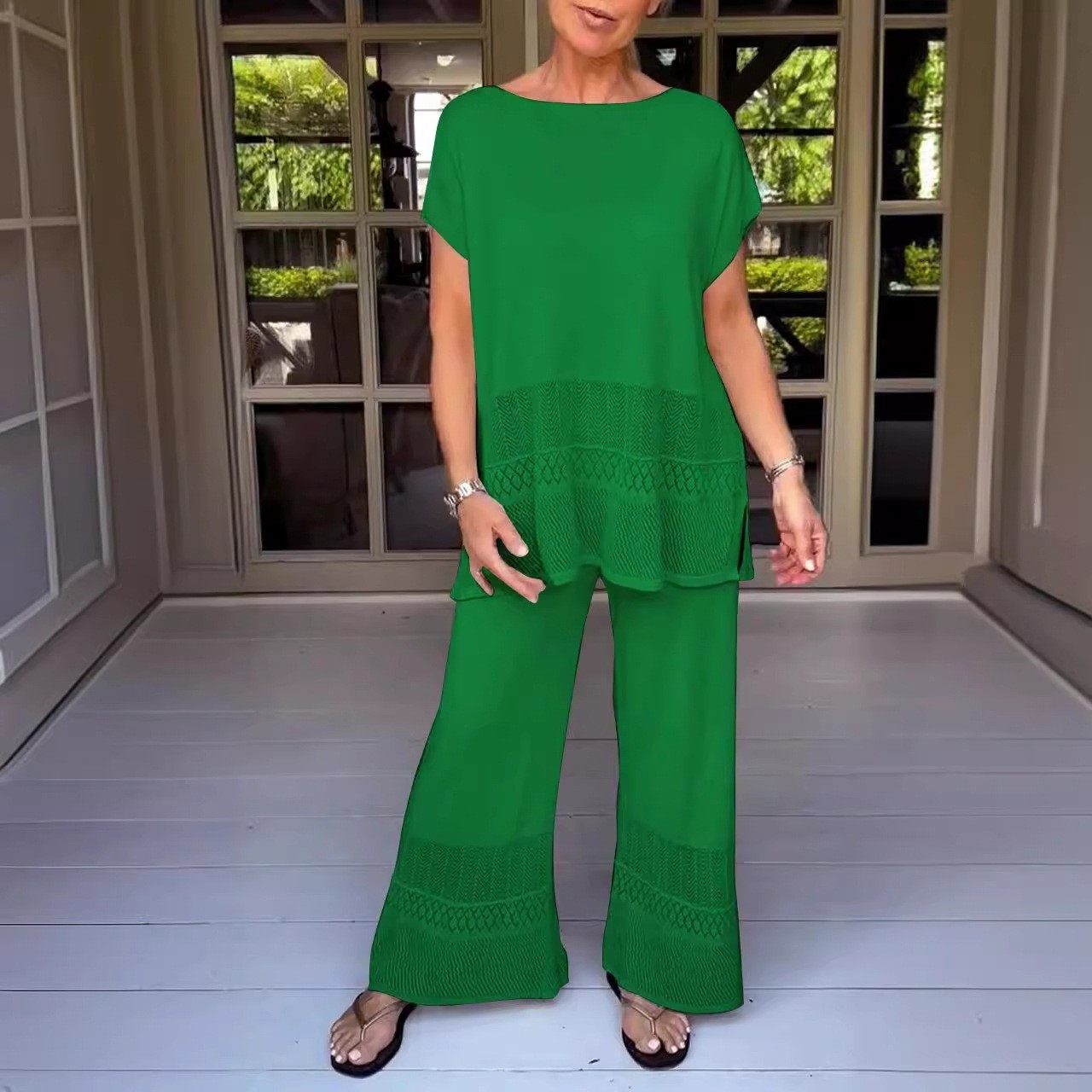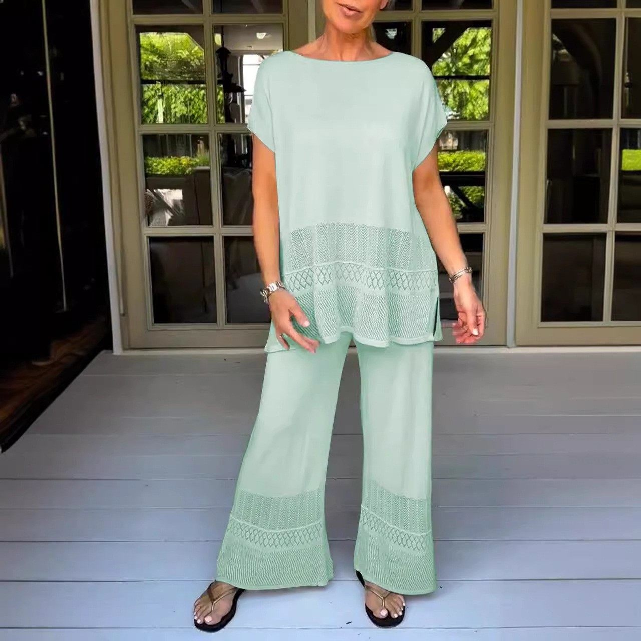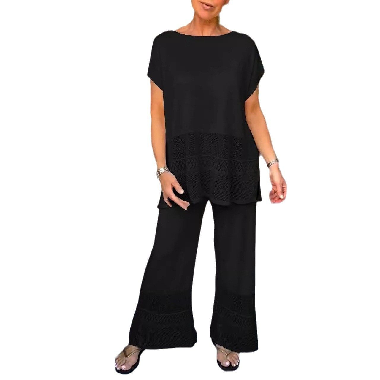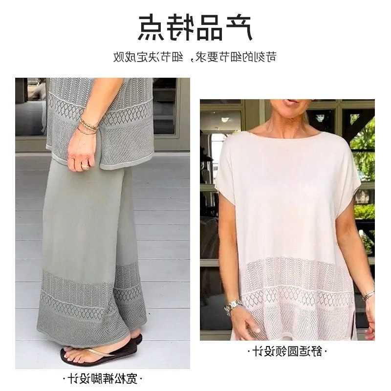 镂空上衣宽松弹性松紧腰长裤 套装 休闲时尚 热销亚马逊两件套女式