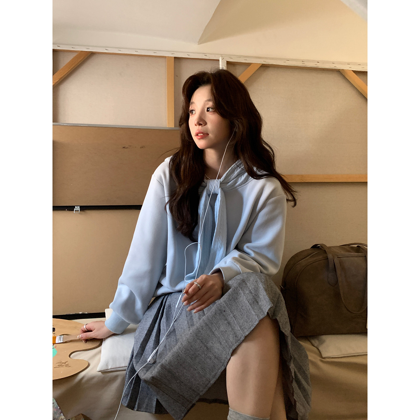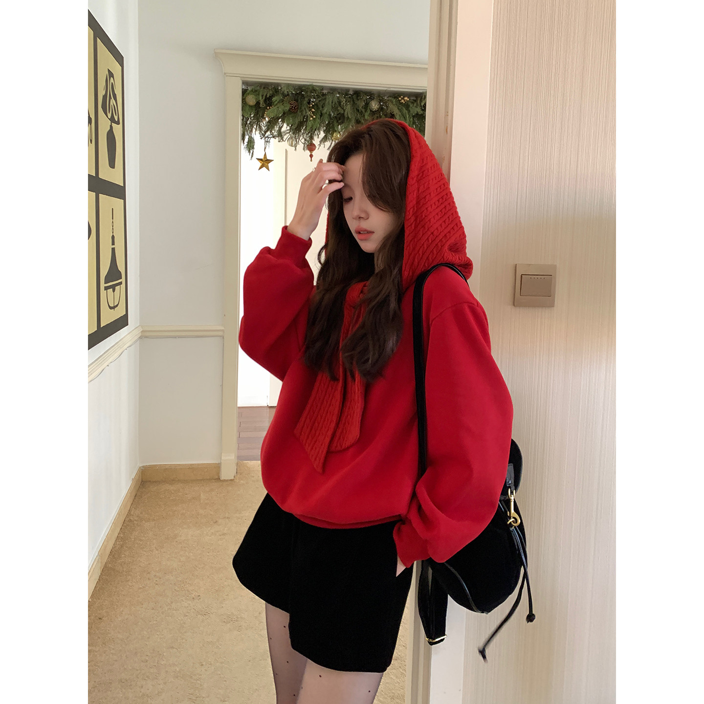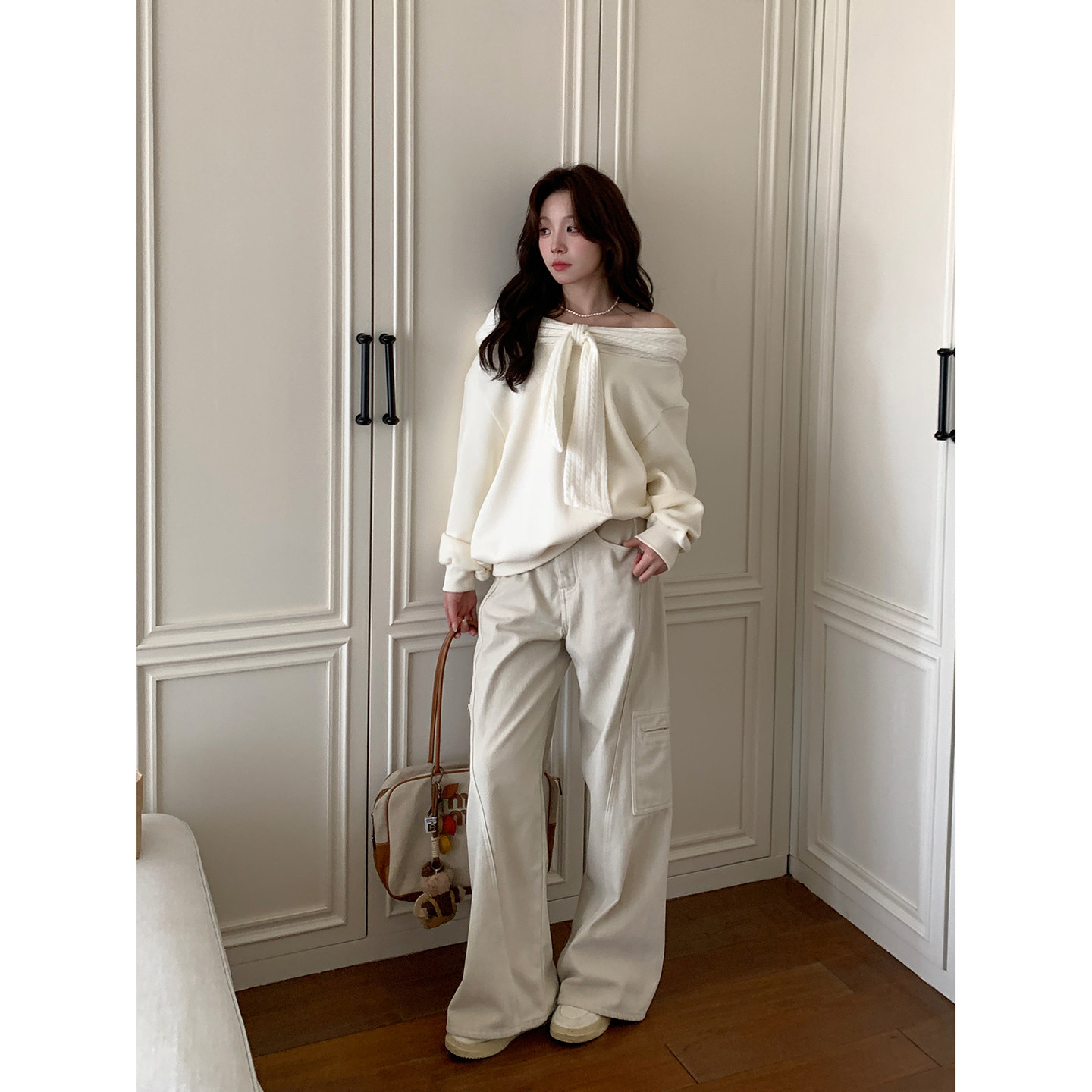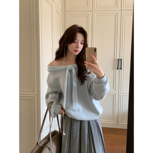 Even一雯 韩系高智感秋冬温柔一字肩蝴蝶结加绒卫衣 冬日协奏曲