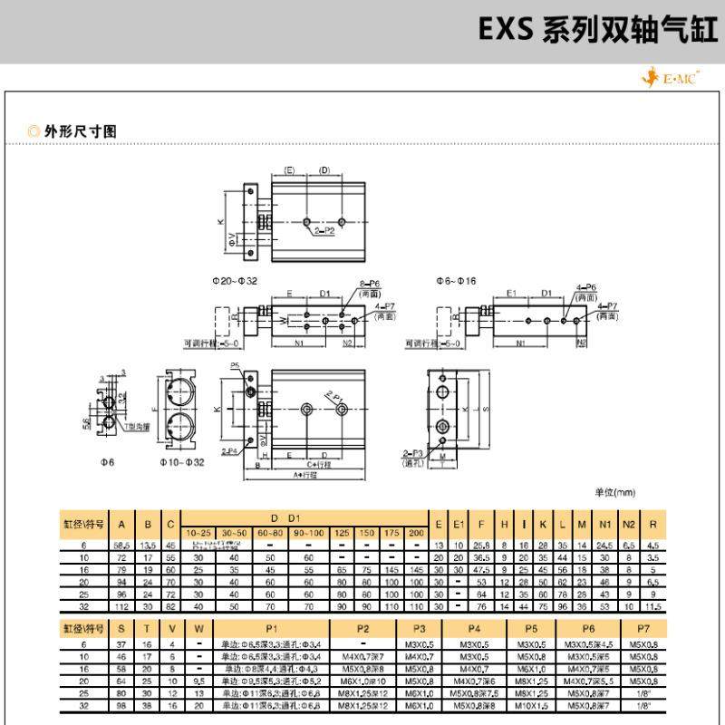 亿太诺E.MC双轴气缸EXSM25X10X20X25X30X40X50X60X70X75X80X90X