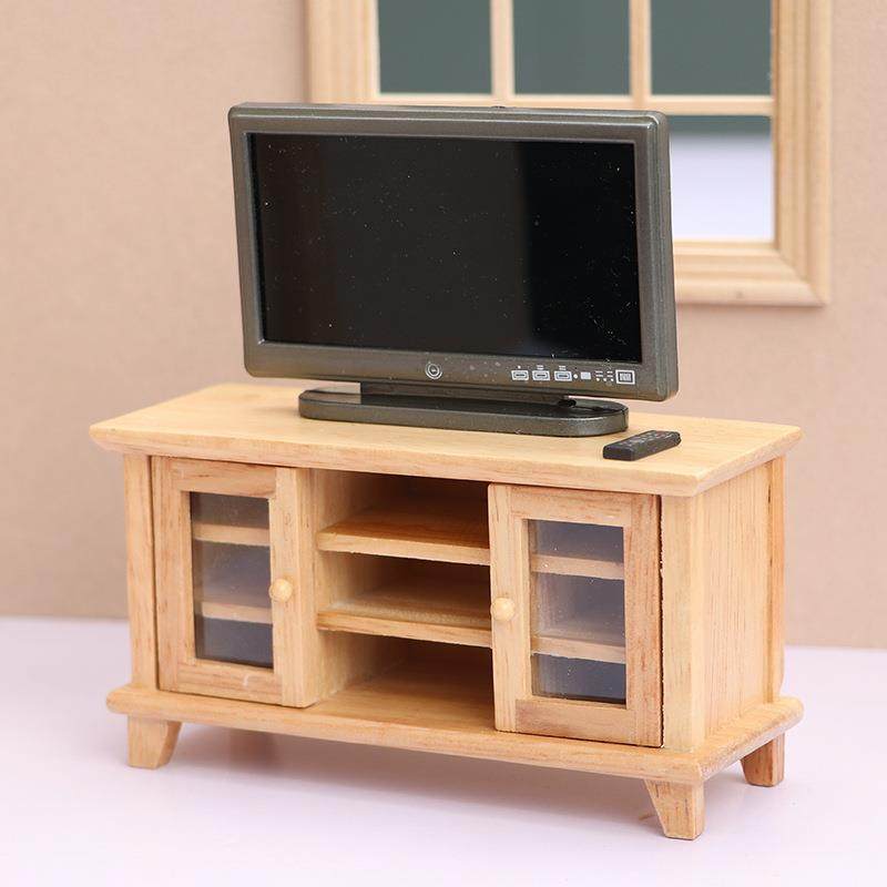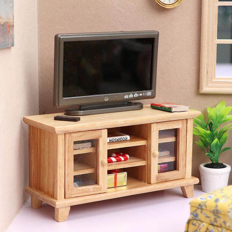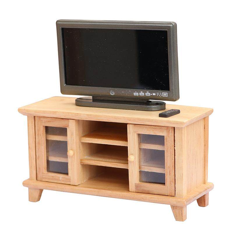 12娃娃屋dollhouse小屋迷你家具客厅微场景原木色双开门电视柜