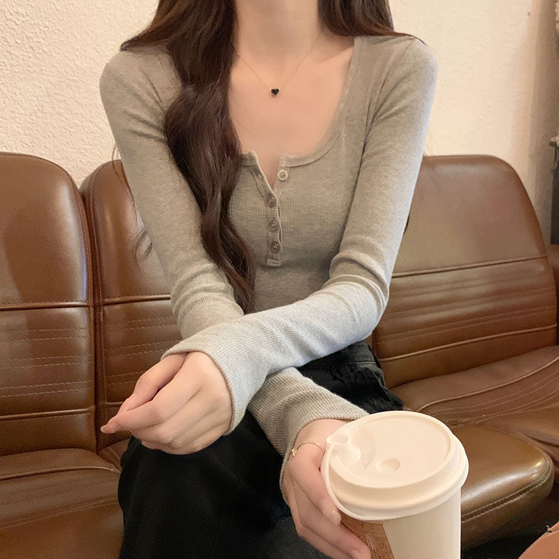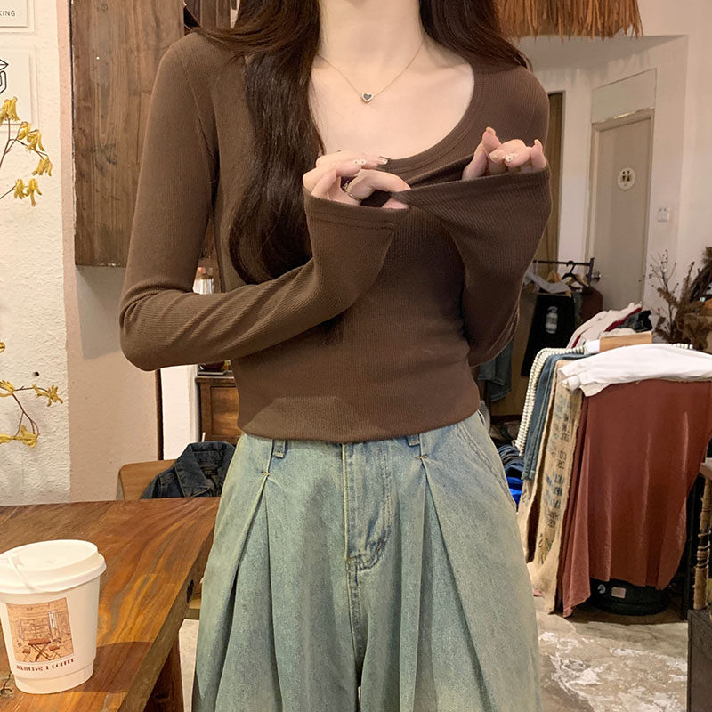 小个子早秋长袖 班尼路杏色打底衫 v领修身 2025新款 女t恤H 内搭秋季