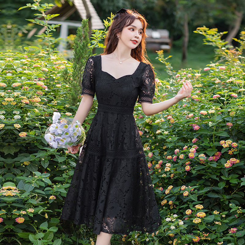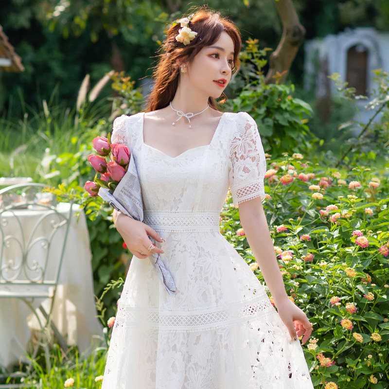 显瘦白色超仙气质森系法式 2023夏装 修身 蕾丝连衣裙韩版 中长裙 新款