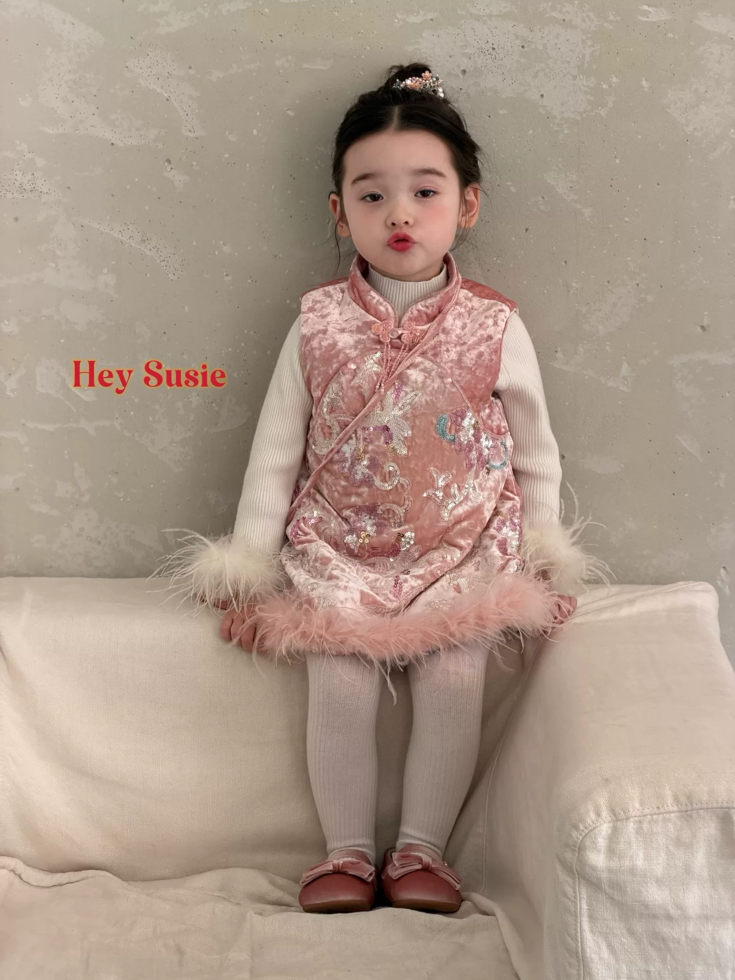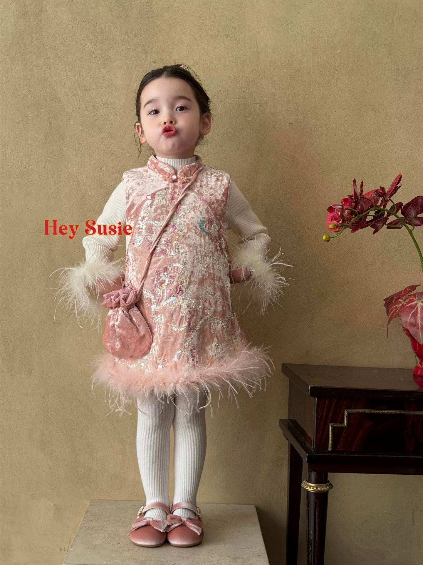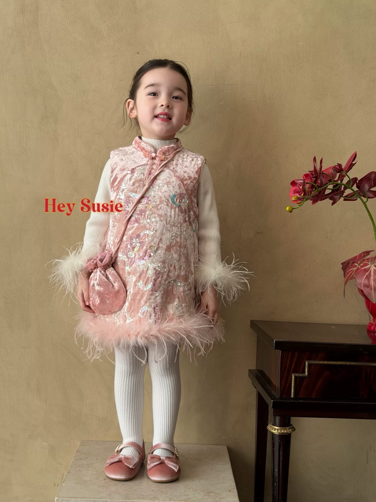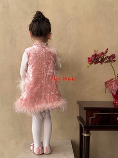 苏西女童2025新款 秋冬加绒刺绣背心裙旗袍裙生日宴会年服连衣裙