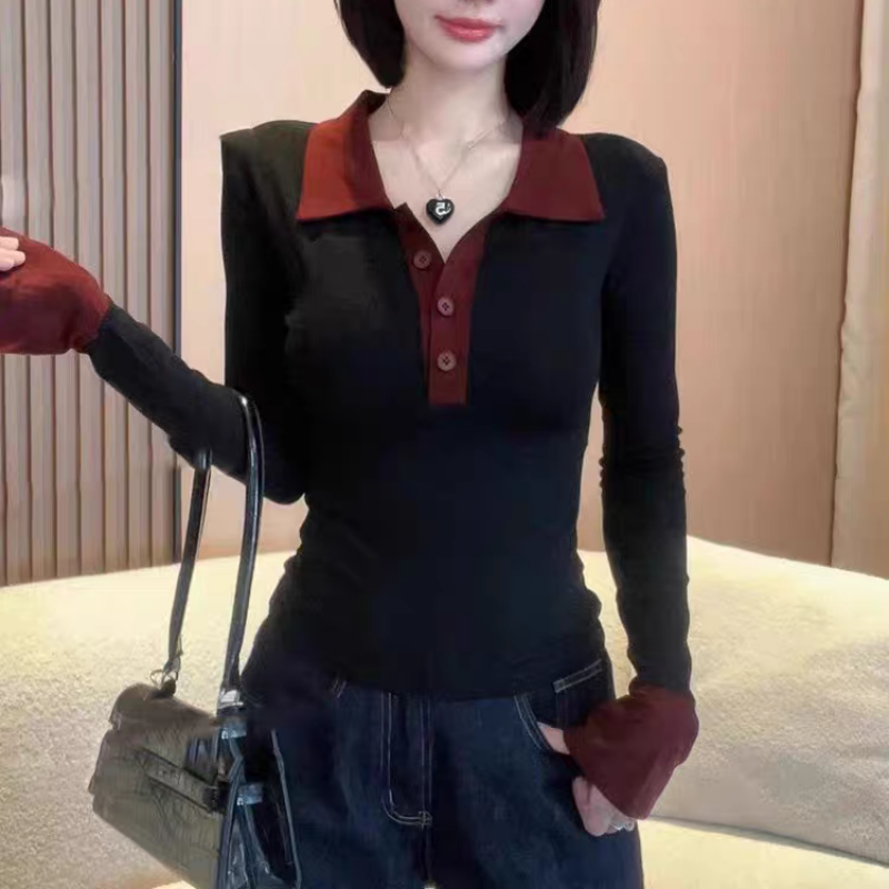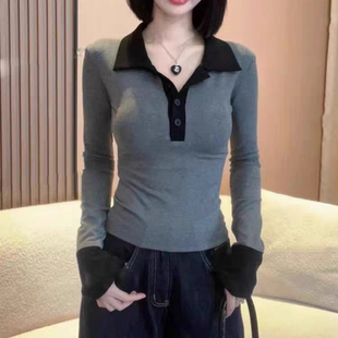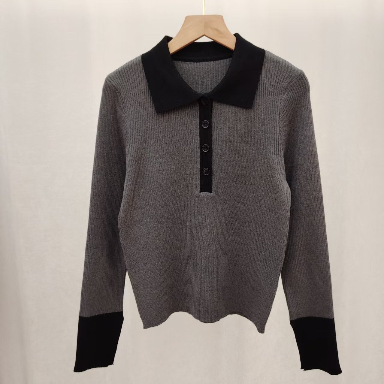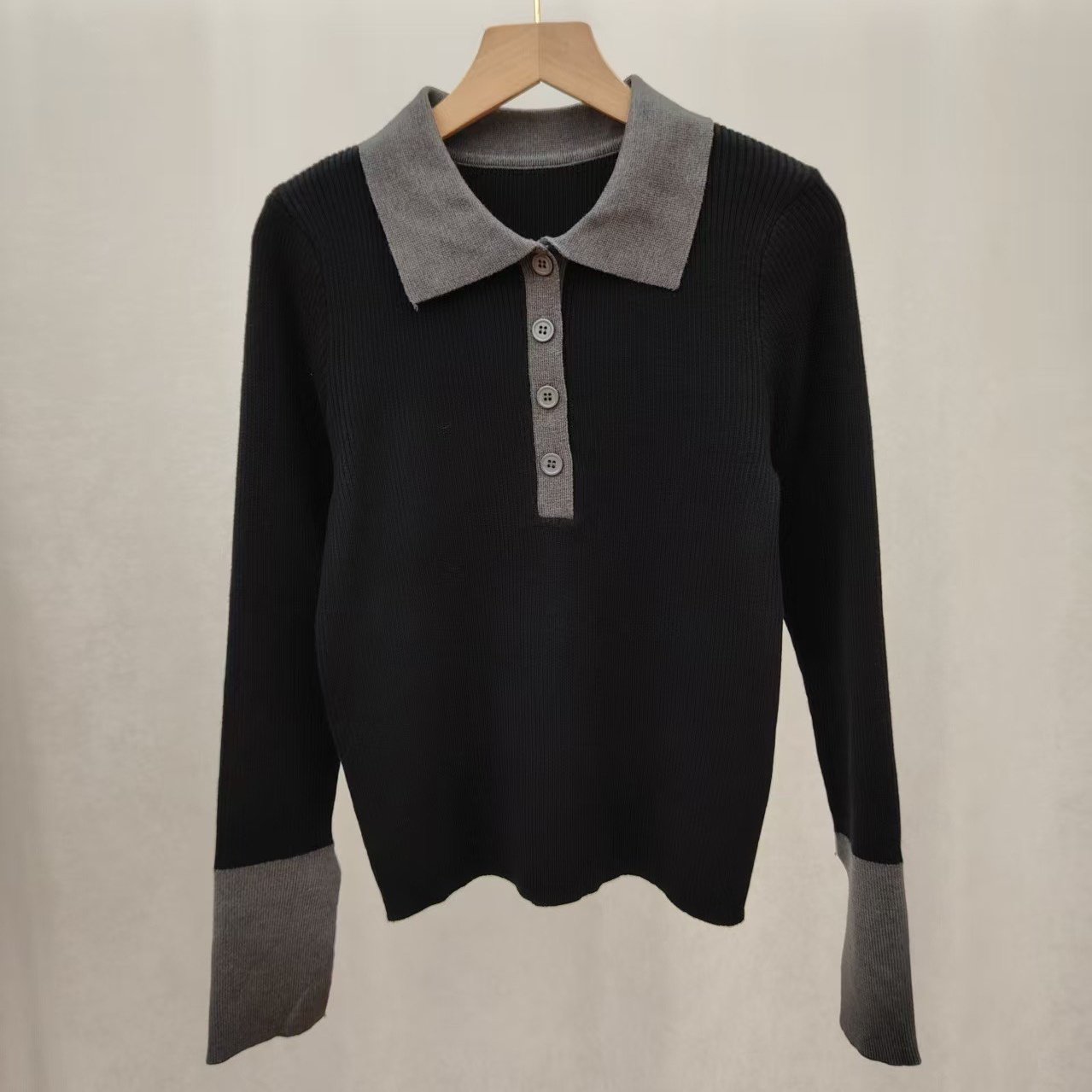 2025新款 撞色polo衫 打底针织衫 修身 女秋冬穿搭内搭上衣 翻领喇叭袖