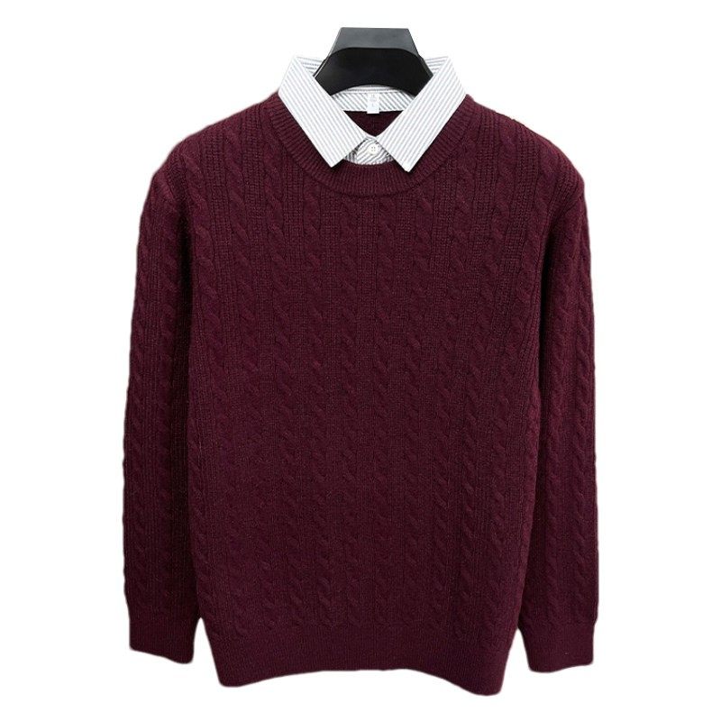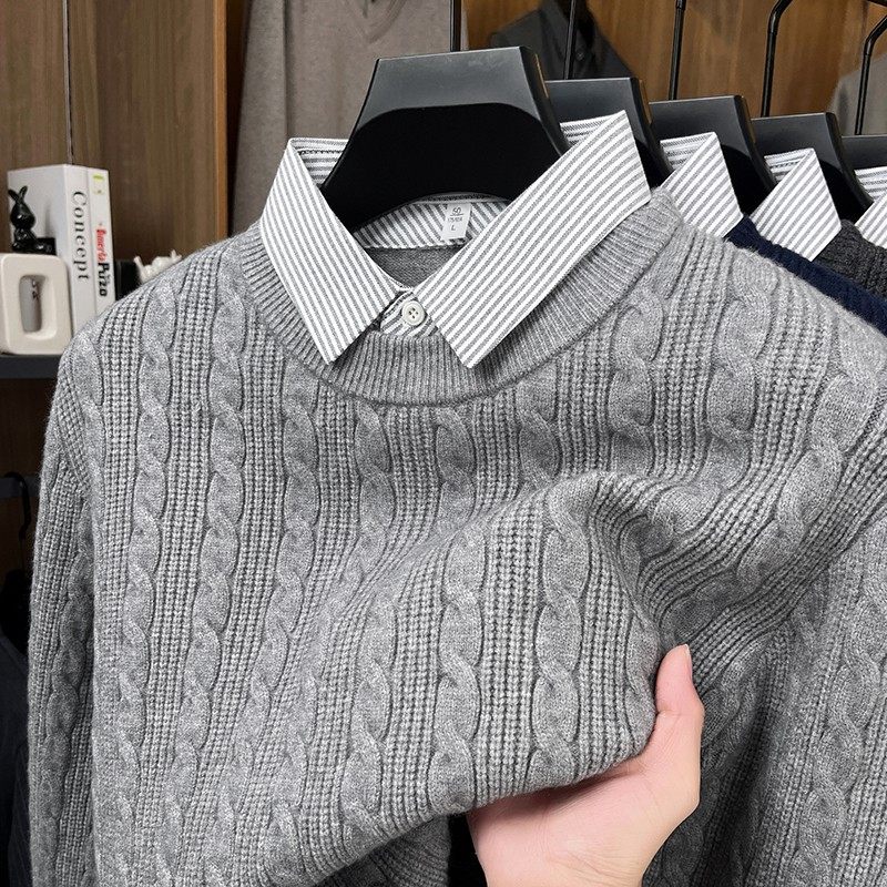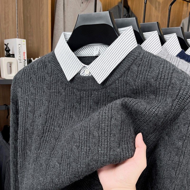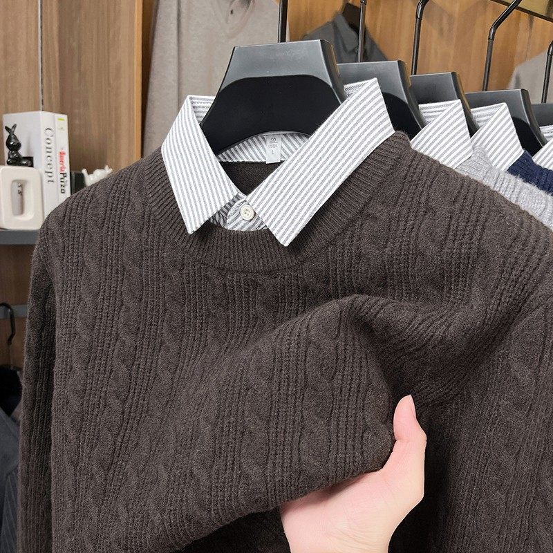 秋冬季 领针织衫 含羊毛保暖加厚麻花纹毛衣 假两件衬衫 高端重磅男士