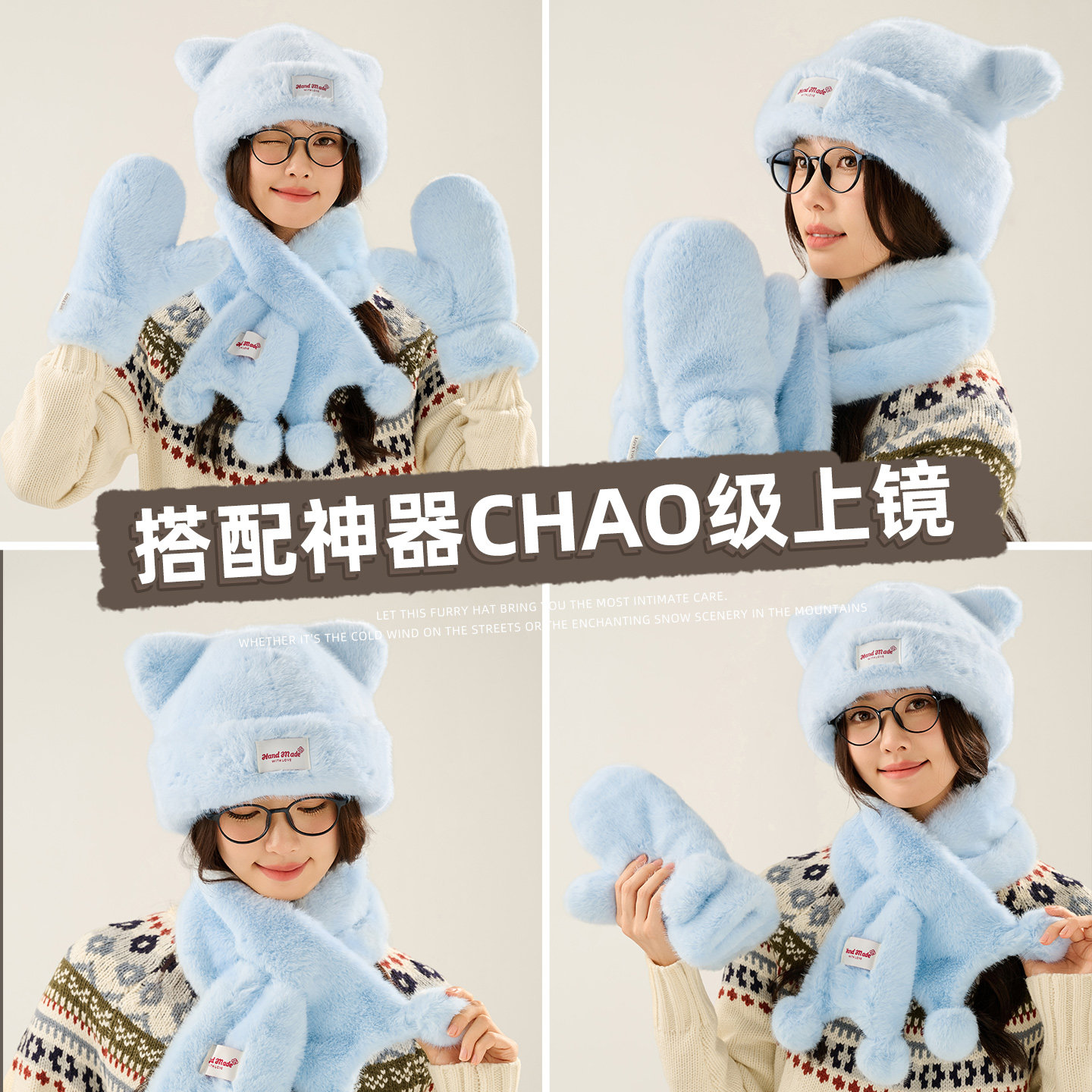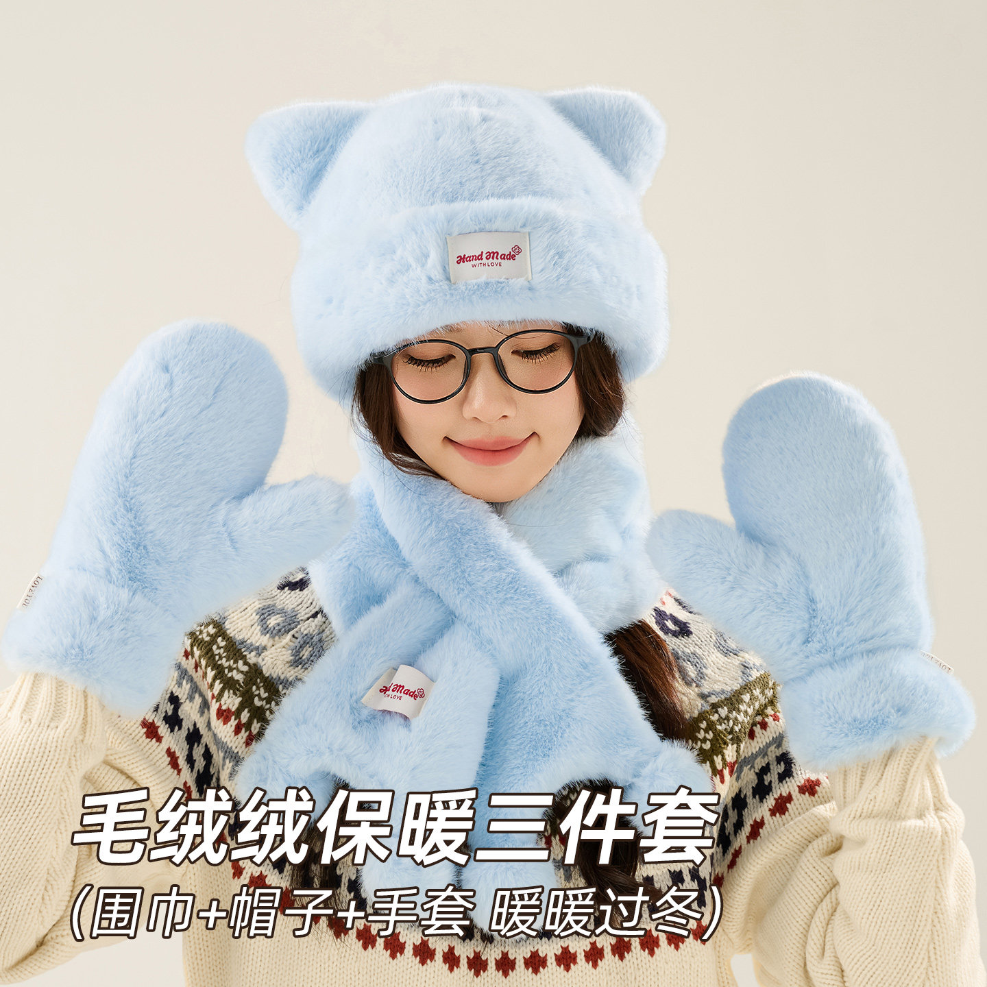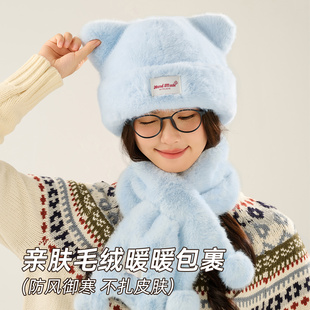 蓝色毛绒帽子围巾手套三件套东北哈尔滨冬季 保暖女骑车防风防寒帽